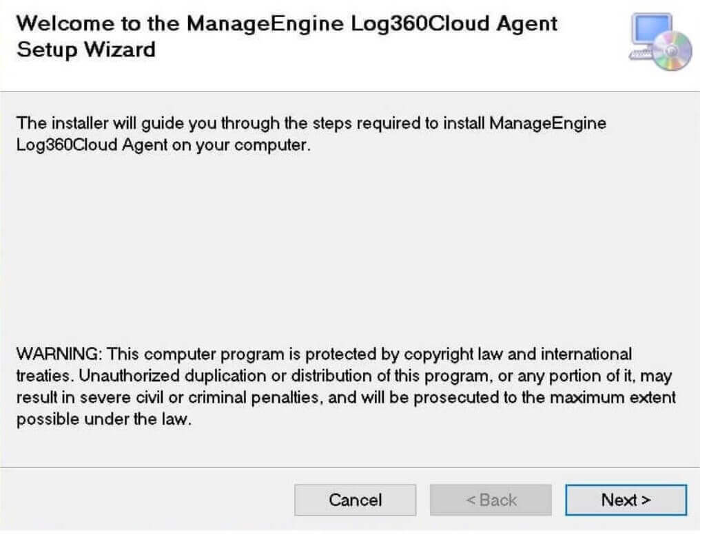 - Log360CloudAgent.msiファイルを実行します。インストールウィザードが始まります。