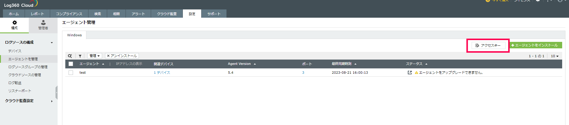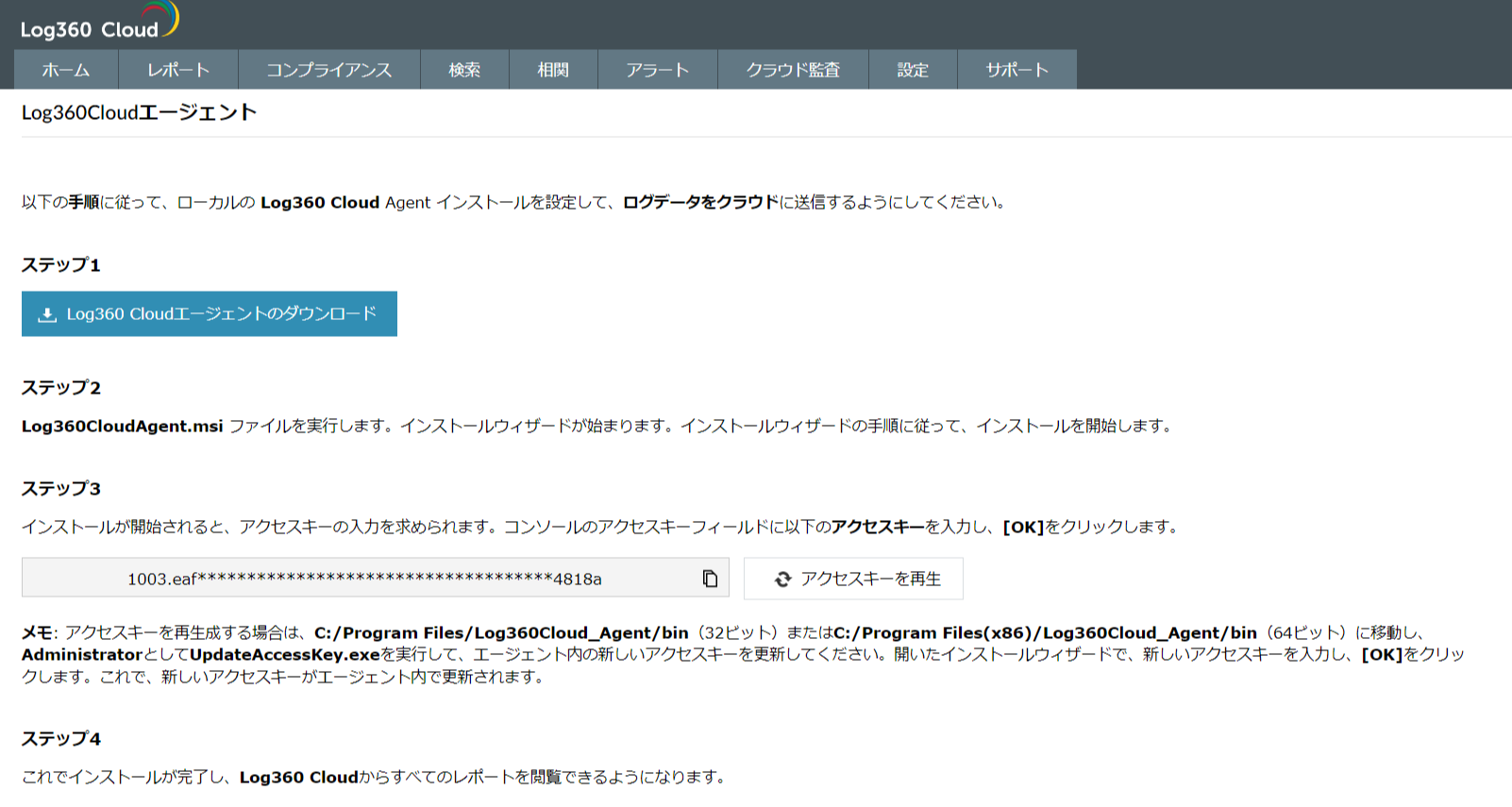 エージェントとデータを同期するためには、Log360 Cloudのセキュリティアクセスキーを取得し、