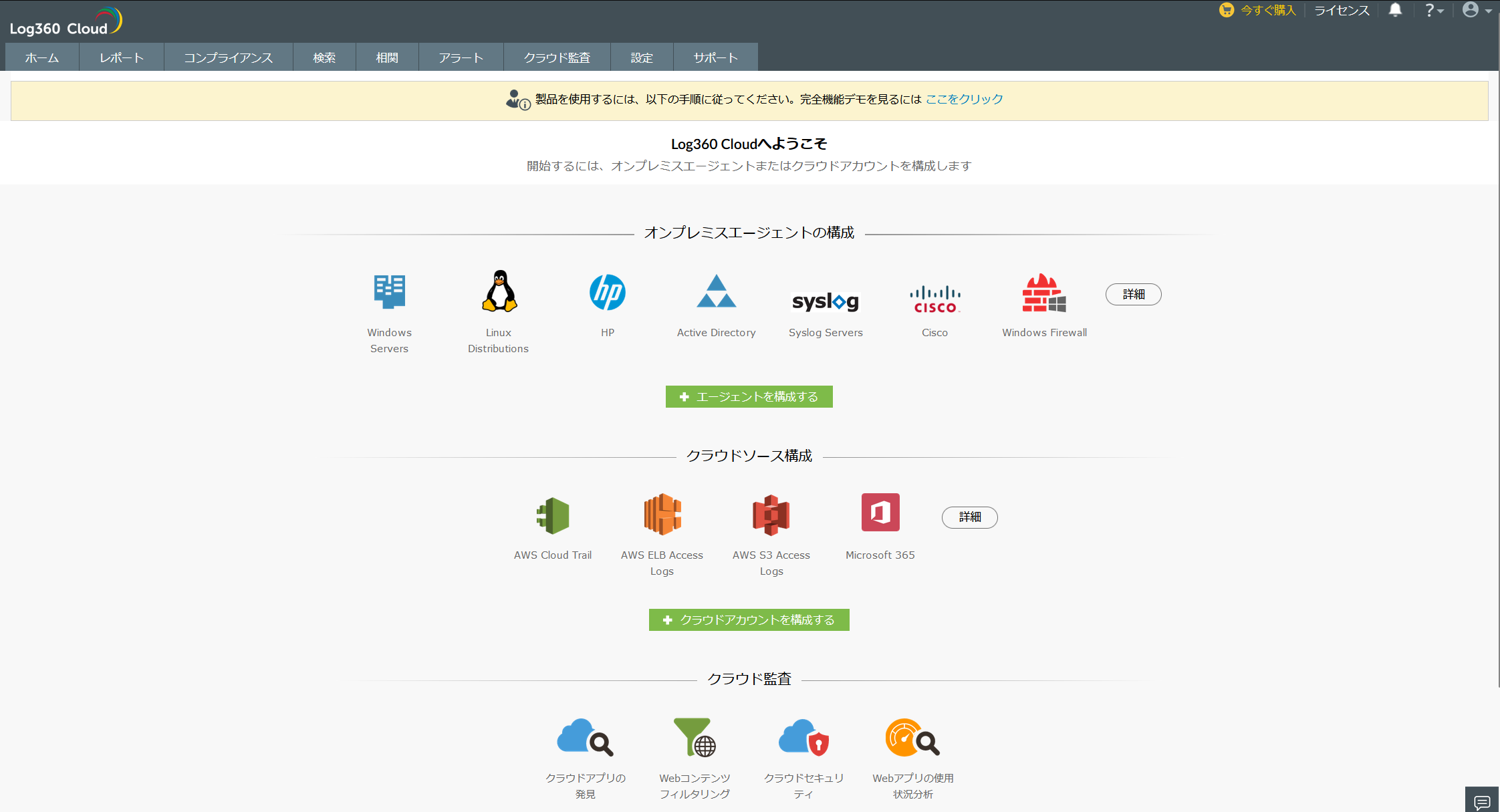 Log360 Cloudに初めてアクセスした際に表示される以下のページで「+クラウドアカウントを構成する」をクリック、 または、[設定]タブ→[管理者]→[管理]→[アカウント設定]→[クラウドアカウントを構成]をクリックします。