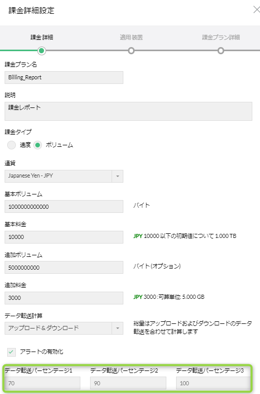 ※課金タイプが[ボリューム(容量)]の場合、アラートを3段階(基本ボリューム(容量)値に対してX%,Y%,Z%で指定)で設定可能です。 - [税やその他料金の追加]から追加金額を設定し[+]アイコンをクリックして追加します。