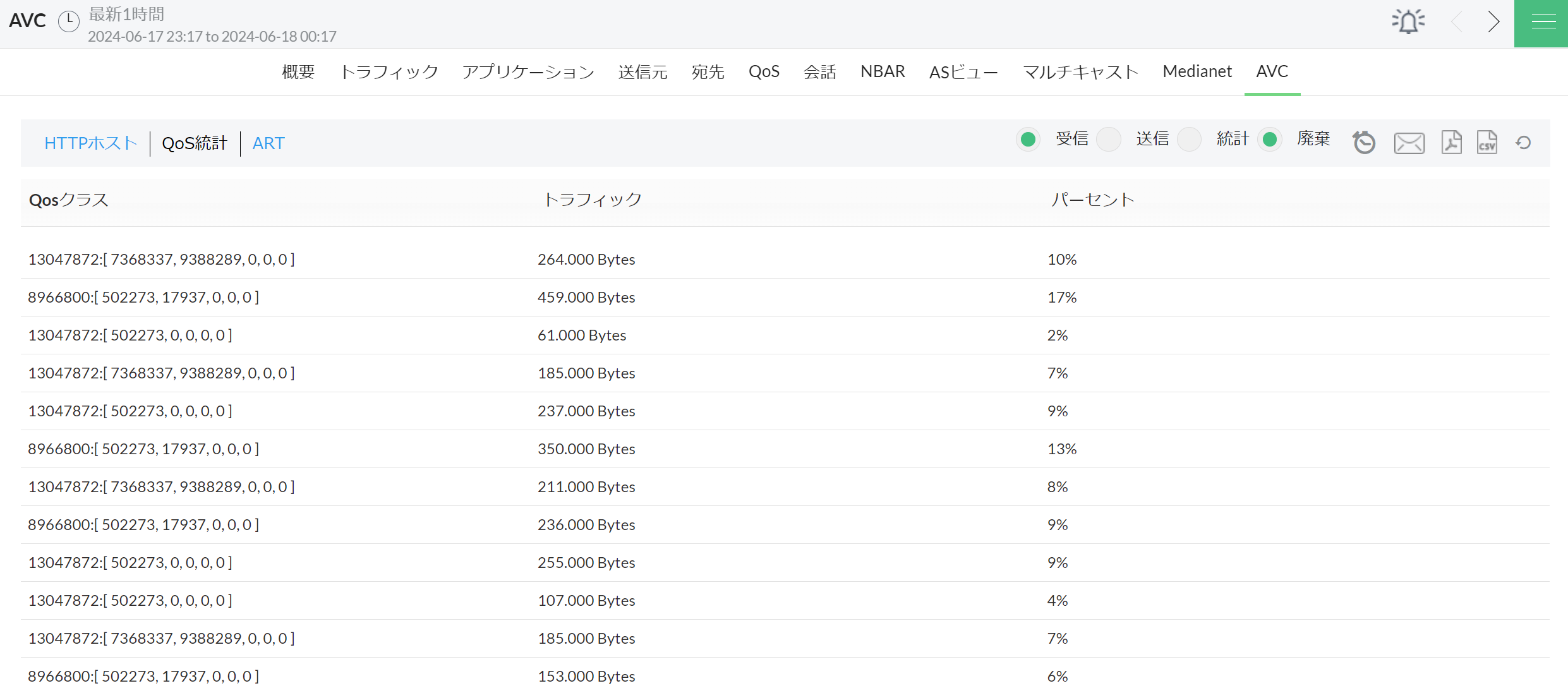 QoS統計タブでは、QoS固有の情報が、主に統計レポートと廃棄レポートの2つでリスト化されます。統計レポートでは、アプリケーションのクラス優先度と、特定のアプリケーションの配分を確認できます。廃棄レポートでは、各トラフィッククラスの廃棄などがキューイングステータスとともにリスト化され、ITチームはQoS設定の効率性を検証できます。