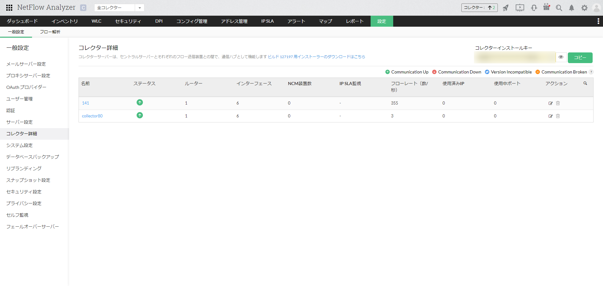 こちらの設定ページでは、コレクターインストールキーの他、セントラルサーバーが認識しているコレクターの一覧と、疎通の状況が表示されます。