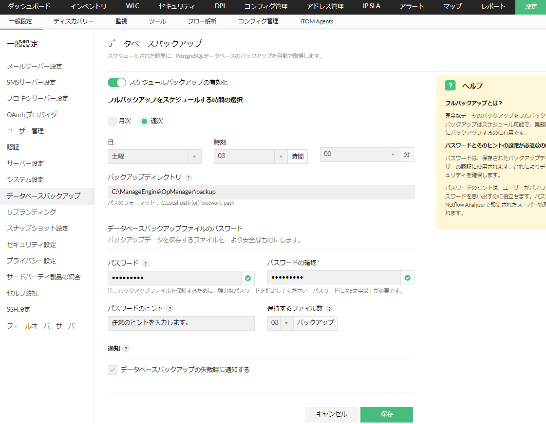 ※世代数を増やすと、HDD要件が世代数分だけ倍加します。 - バックアップ失敗時のメール通知が必要な場合「データベースバックアップの失敗時に通知する」のチェックボックスをクリックします。