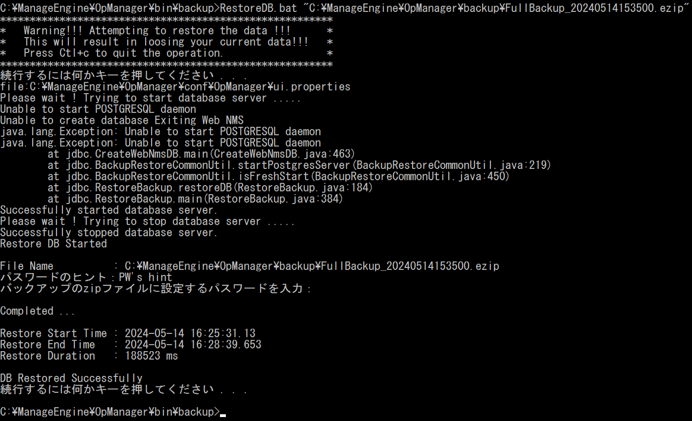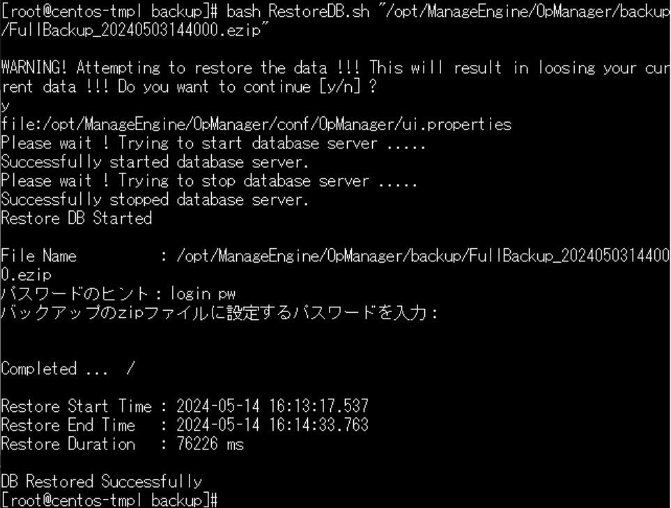 bash RestoreDB.sh "/opt/ManageEngine/OpManager/backup/FullBackup_20240503144000.ezip" - パスワードを入力します。