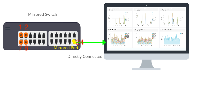 上記の図では、ポート1、2、7、8は、監視用の装置の最後のポート(ポート24)にミラーリングされています。ここで、ミラーリングされたネットワーク パケットはすべて、直接接続のあるOpManagerサーバーに到達します。