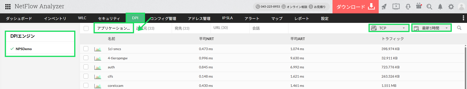 画面左側の[DPIエンジン]から、データ参照の対象とするDPIエンジン(DPI機能が有効なNPS)の選択が可能です。