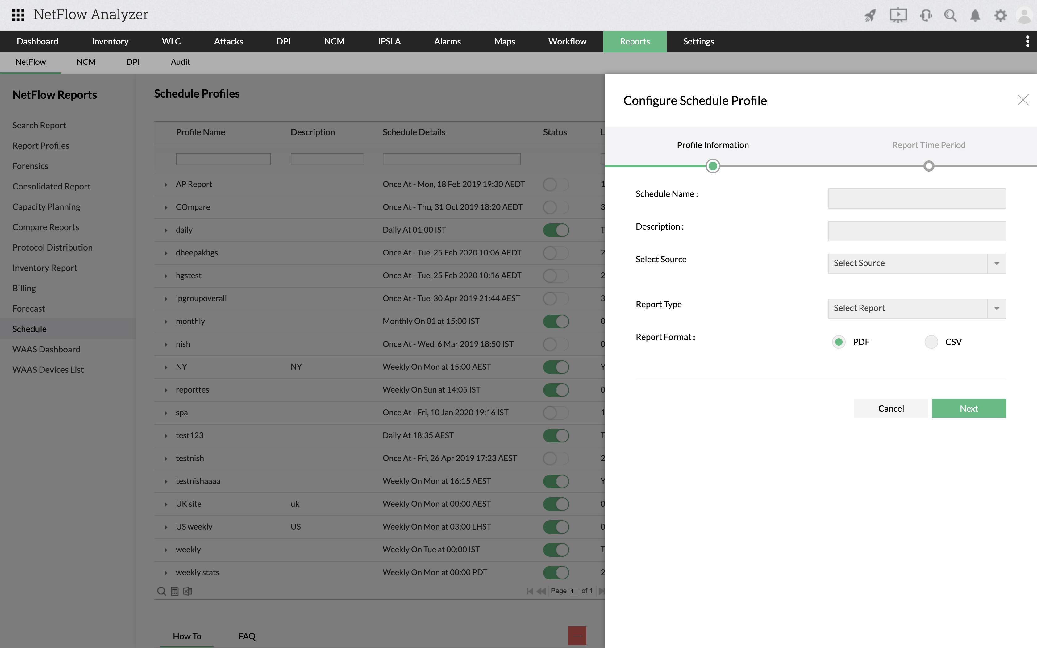 NetFlow Analyzerでレポートのスケジュール設定を行うには