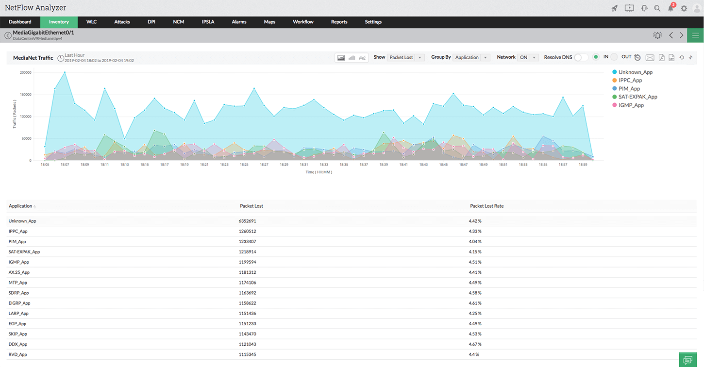 NetFlow Analyzerは受信フローデータ内のMedianet情報を用いて、ネットワーク内のメディアトラフィック量(送受信)、遅延(レイテンシー)、パケットロス、ジッターを監視します。
