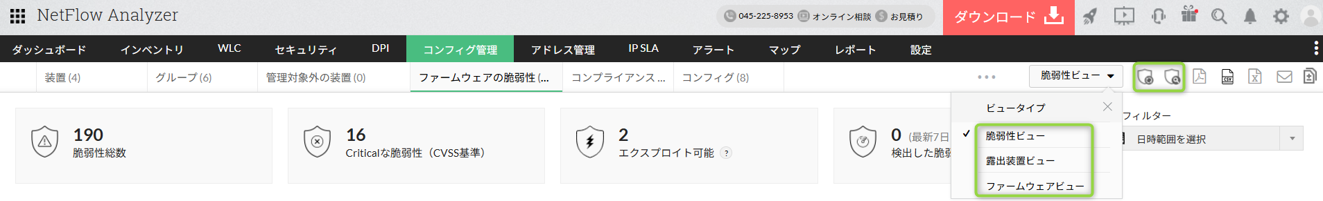 ※NCMマニュアル「ファームウェア脆弱性管理」内の[すべての脆弱性][露出装置][配付バージョン]機能はそれぞれ、上記スクリーンショット内のプルダウンメニュー[脆弱性ビュー][露出装置ビュー][ファームウェアビュー]に該当します。
