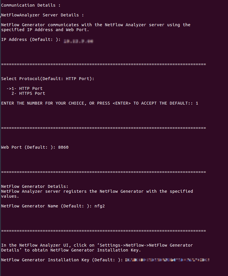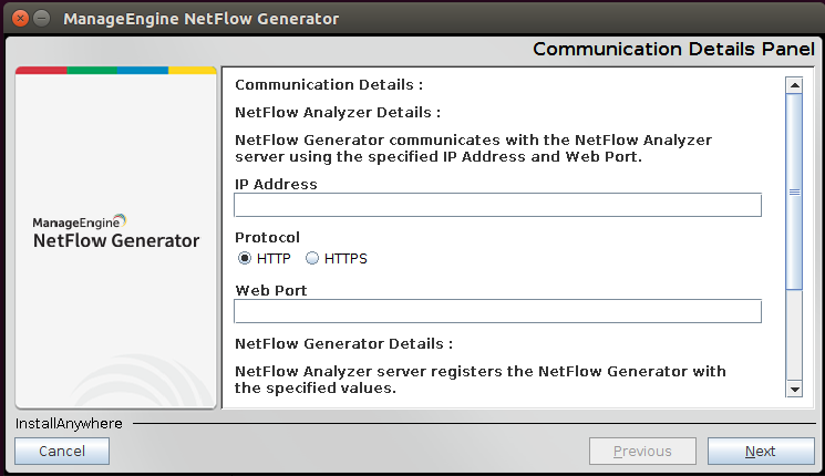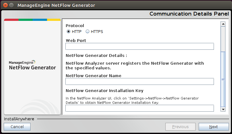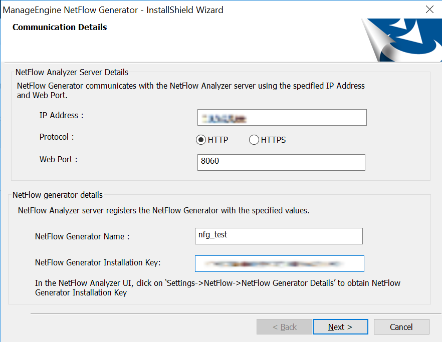 - 通信パネルに、有効なIPアドレス、プロトコル、Webポート、NetFlow Generator名、インストール キーを入力してください。
