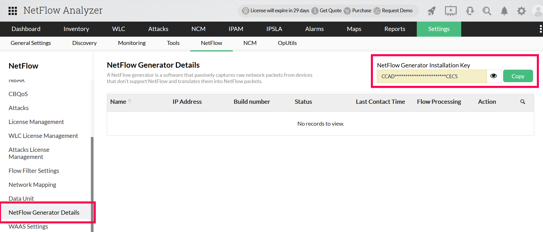 メモ:NetFlow AnalyzerのGUIで、設定 > フロー解析 > NetFlow Generatorと移動すると、お客さまのNetFlow Generatorインストール キーが以下のように表示されます。