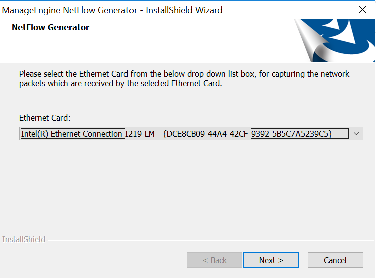 - イーサネット アダプターのドロップダウンで、ネットワーク パケットのキャプチャに使うイーサネット カードを選択してください。「Next」のクリックでインストールを実行すると、NetFlow Generatorはサービスとして起動します。