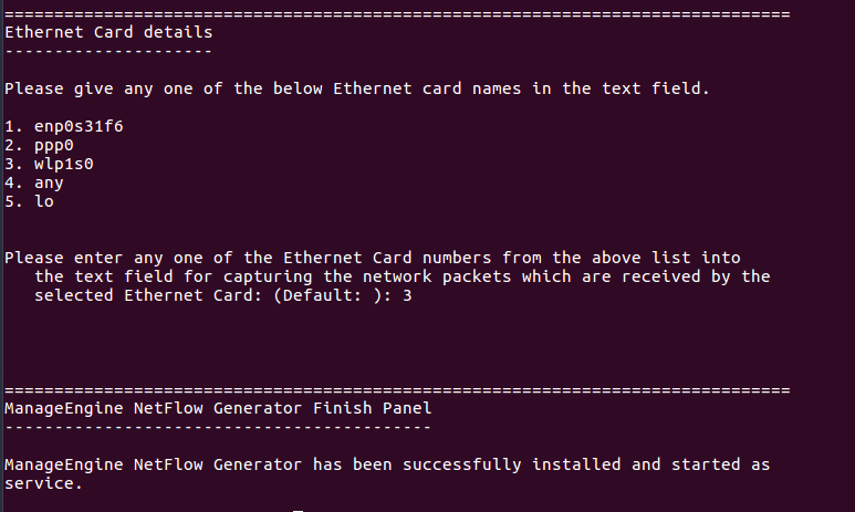 - インストール キーを確認し、NetFlow Analyzerサーバーとの通信が確立すると、イーサネット カード詳細が表示されます。表示される選択肢から、ネットワーク パケットのキャプチャに使うイーサネット カードの番号を選択・入力してください。これによってインストールが完了し、NetFlow Generatorはサービスとして稼働を始めます。