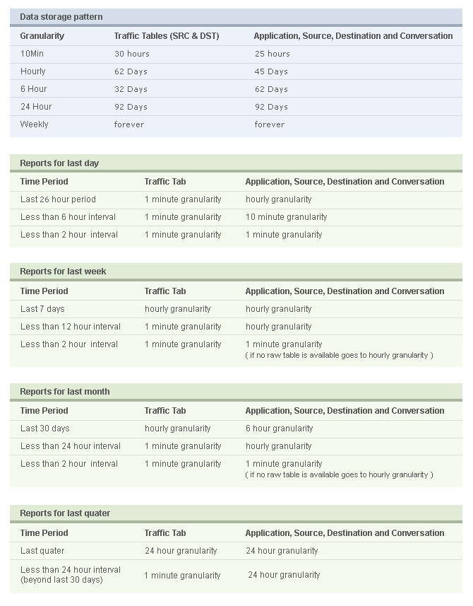 NetFlow Analyzer は、古いデータほど、より粗い形式で集約するため、古いレポートでは、いくつかの急な山形が現れる可能性があります。 前日に関連するレポートが10分粒度のテーブルから生成される一方、先週に関連するレポートは1時間粒度のテーブルから生成されます。