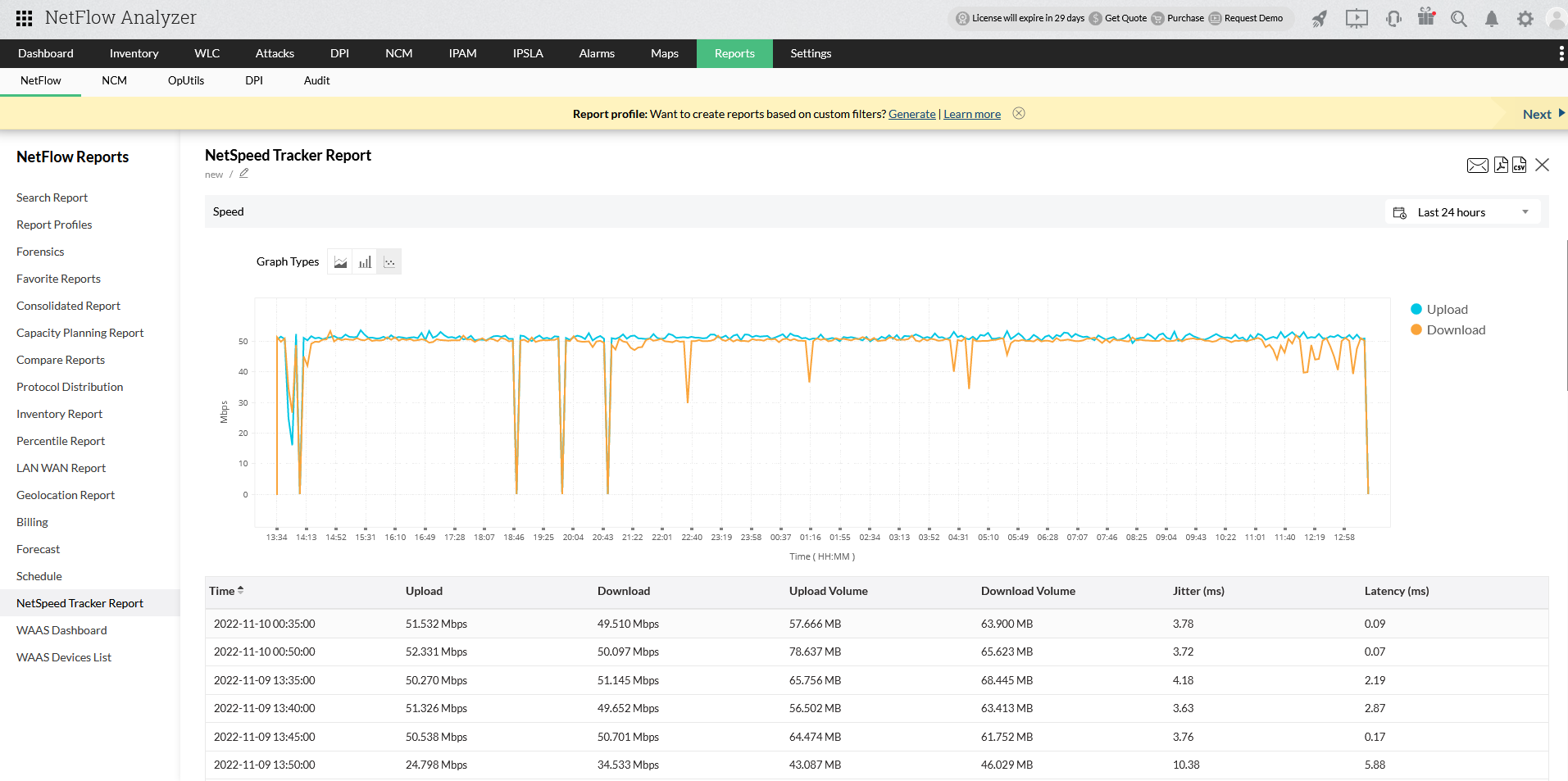 NetSpeed Trackerのレポート機能によって、ネットワーク管理者はリアルタイムに統計情報を取得できます。データはグラフィカルに表示されます。アップロードデータ、ダウンロードデータ、アップロード量、ダウンロード量、ジッター、遅延などの主要なメトリックが表示されます。