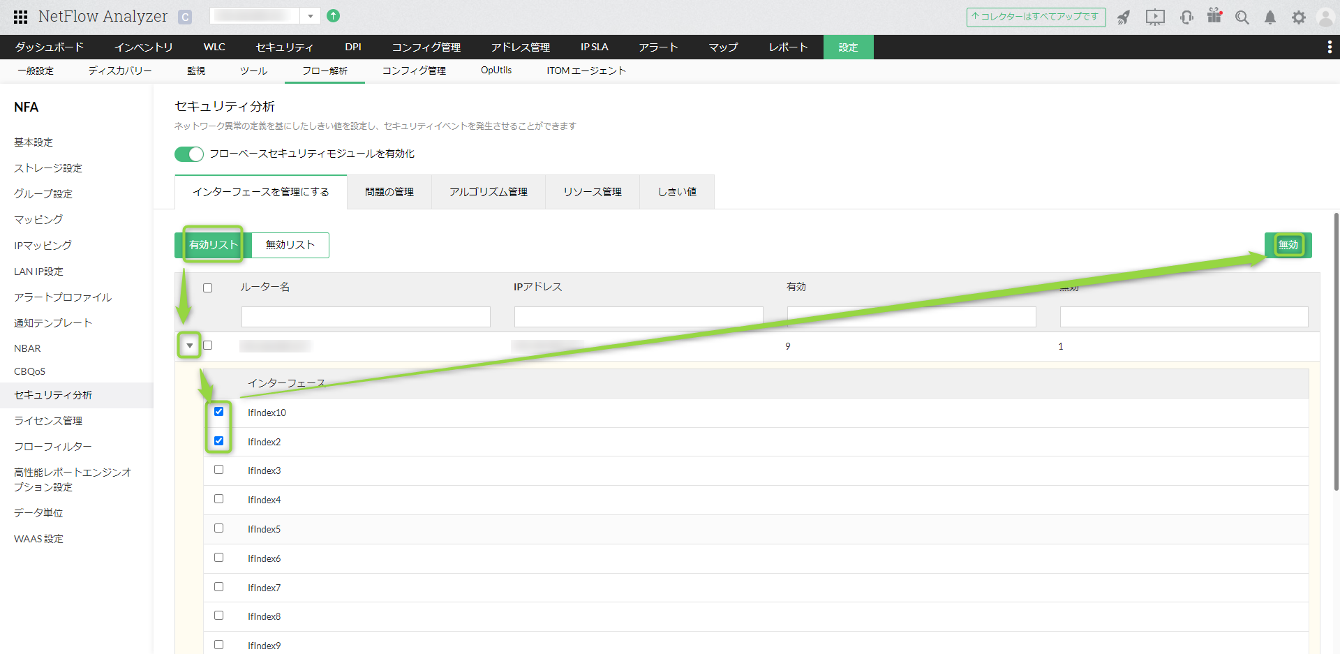 特定インターフェースやルーターのチェックボックスをクリックいただき、画面右上[無効]をクリックすることで、監視対象外として設定することが可能です。