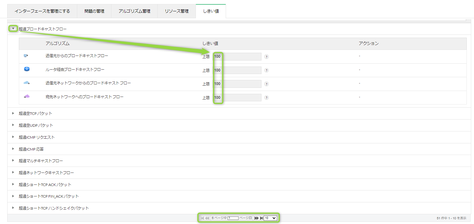 デフォルト値は全て100(パケット数/セッション)で設定されていますが、攻撃種類や環境、管理方針に応じた指標数に更新してください。