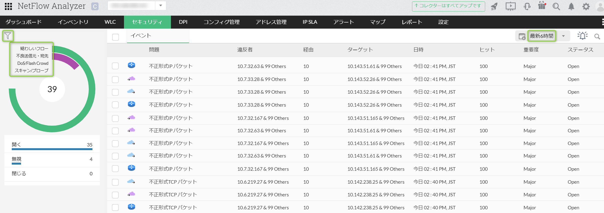 該当コレクターで発生するセキュリティイベントの一覧を表示します。