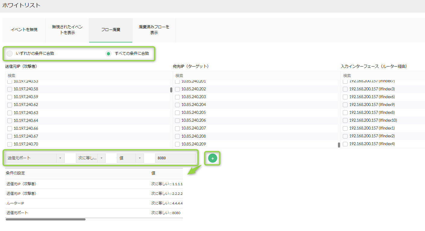 | フロー廃棄 | 以降のホワイトリストの対象として、セキュリティイベントとしてカウントが不要な通信条件を設定いただけます。 |