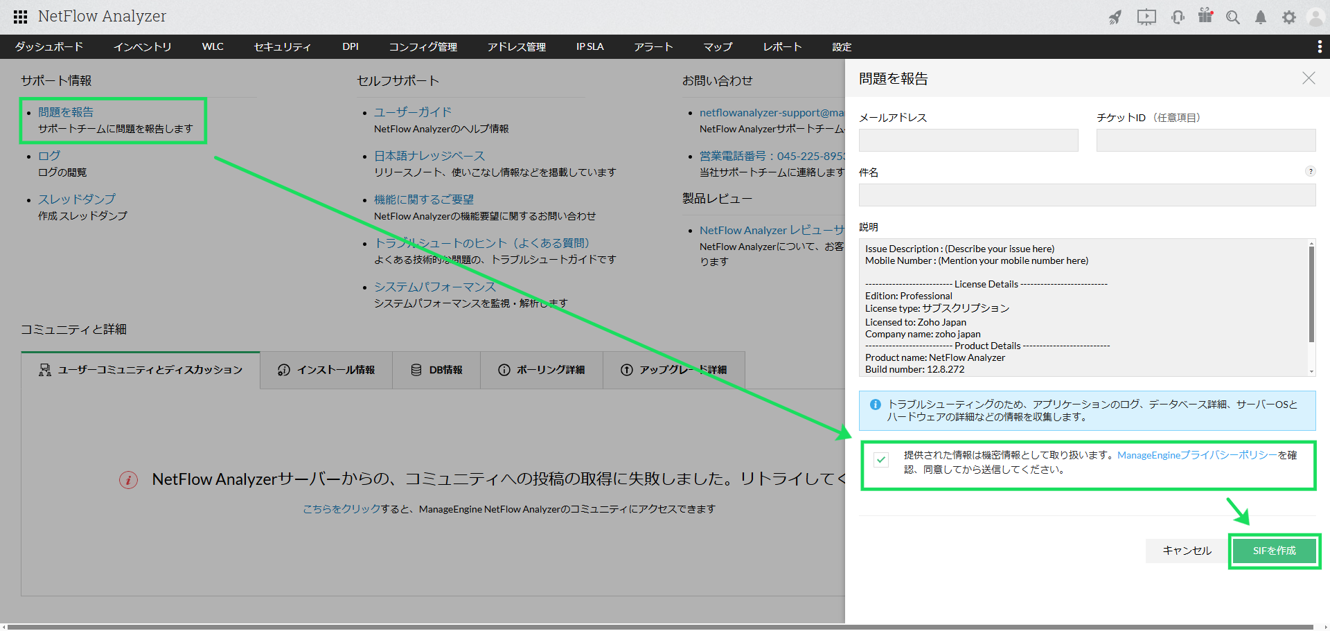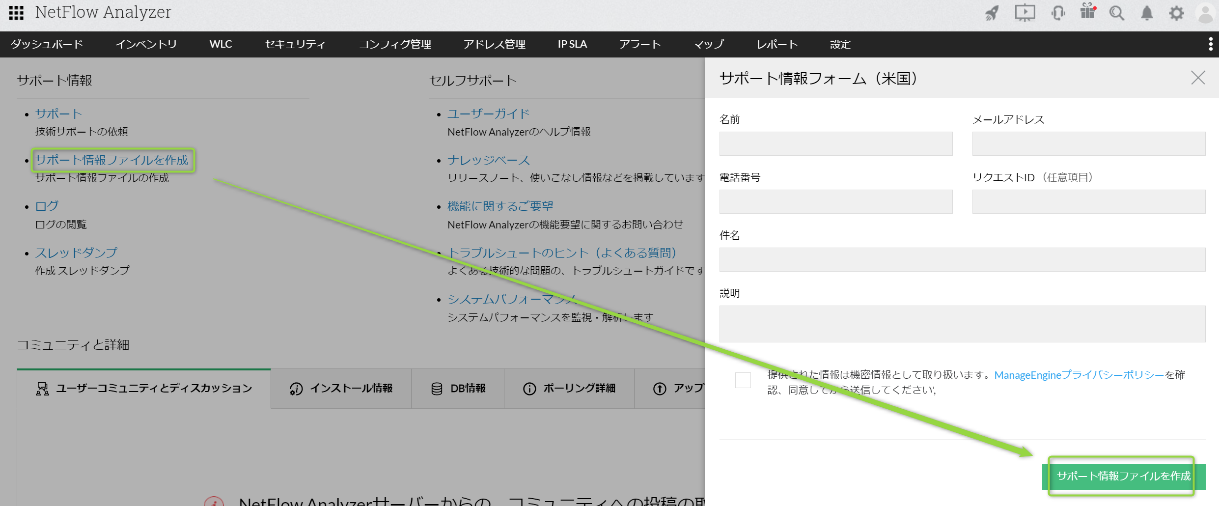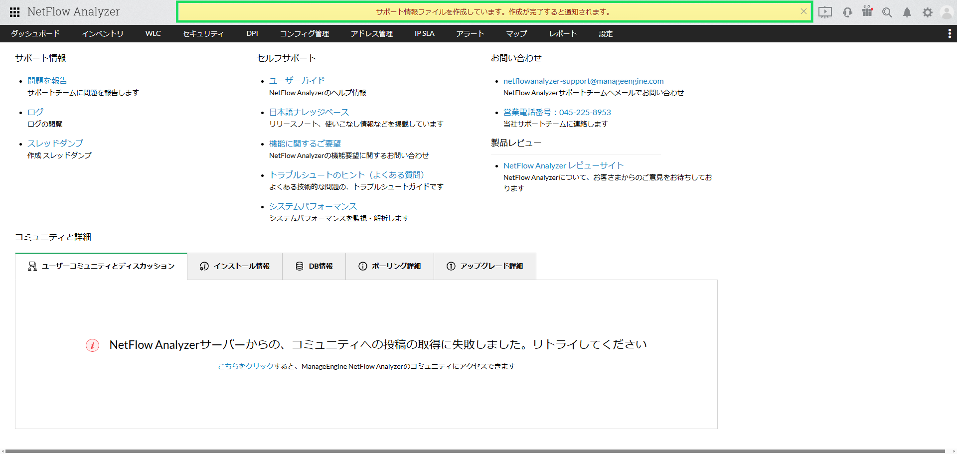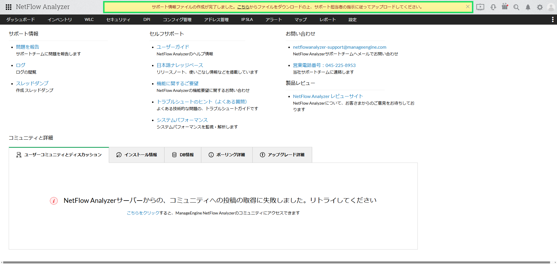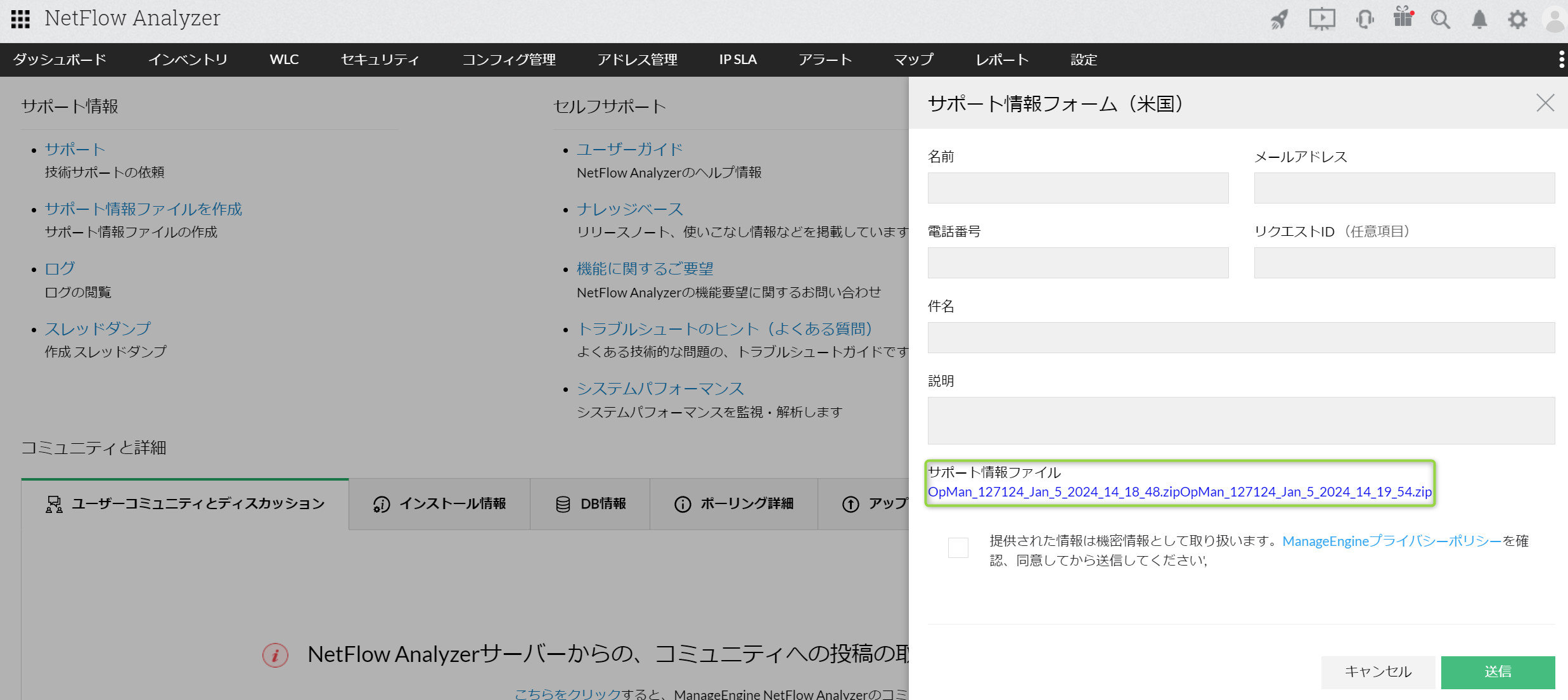 NetFlow Analyzerに関するお問い合わせを頂いた際に、弊社サポート担当よりサポート情報ファイル(SIF:Support Information