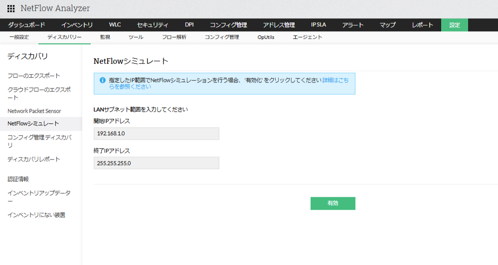 [ディスカバリー]→[NetFlowシミュレート] NetFlowシミュレートでは、サンプルのフローデータを生成しNetFlow Analyzerの機能を試すために利用できます。