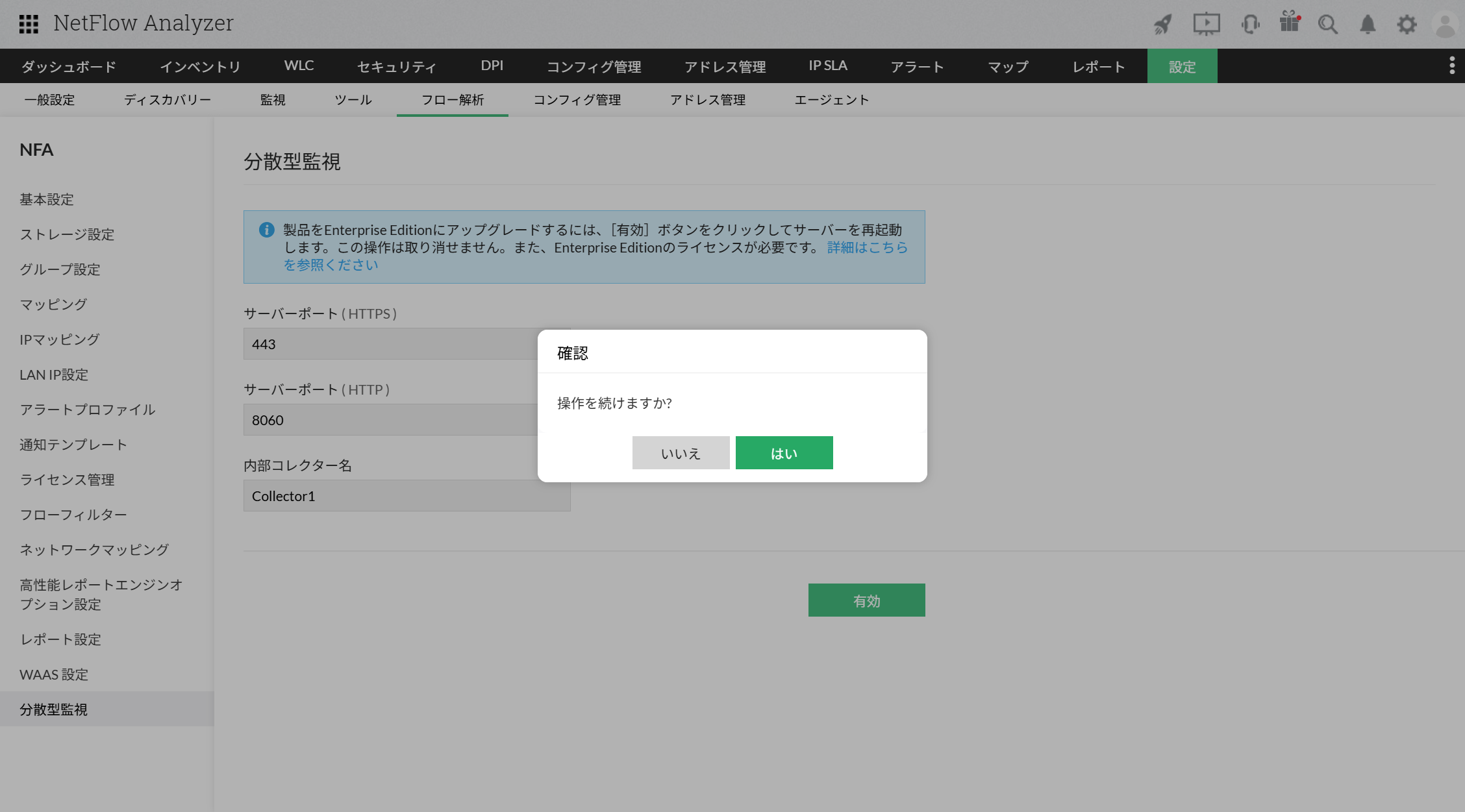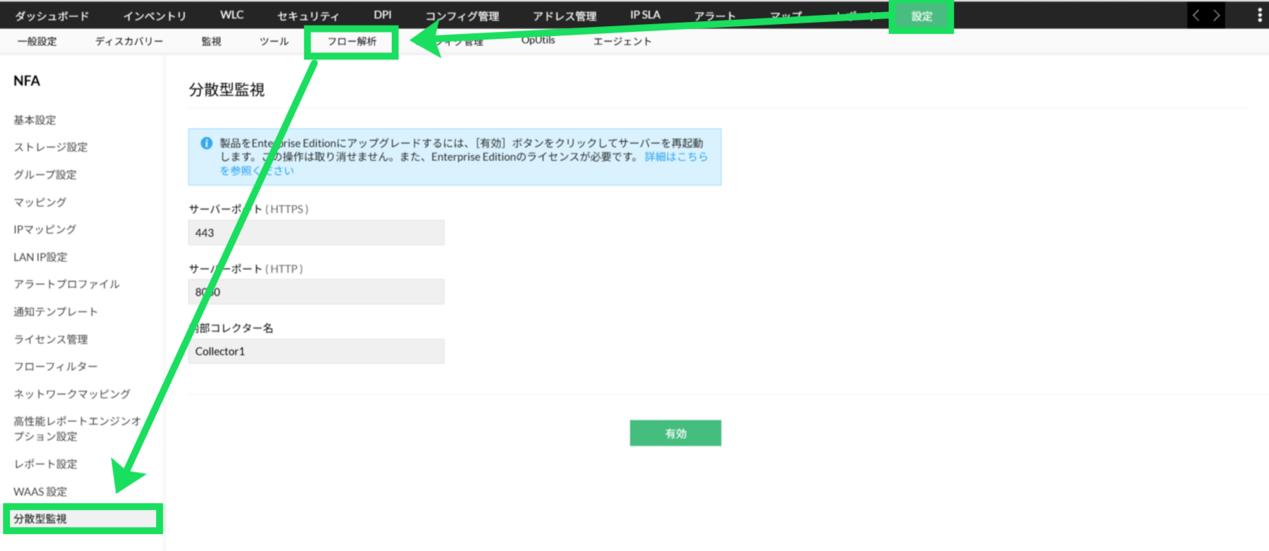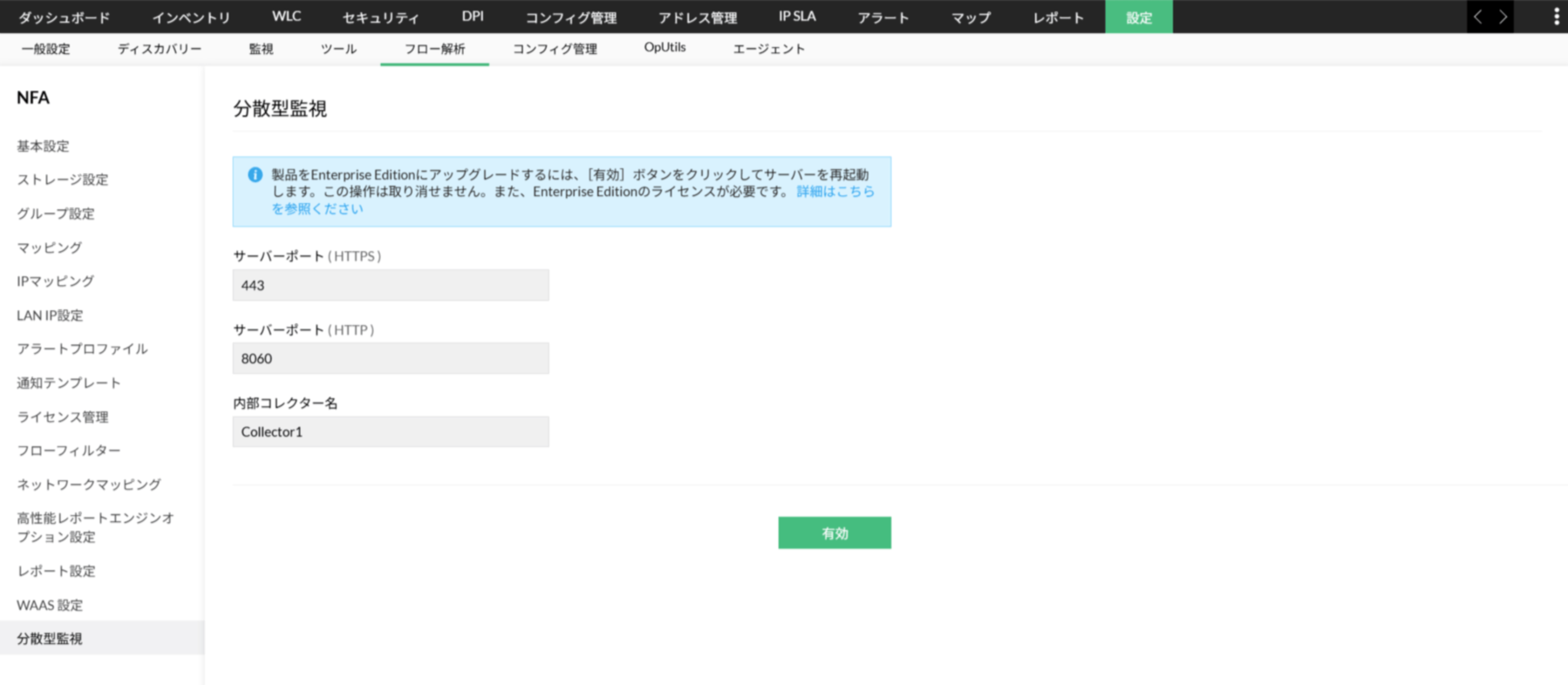 ライセンスの適用方法はこちらをご覧ください。 - [設定]→[フロー解析]→[分散型監視」へ移動