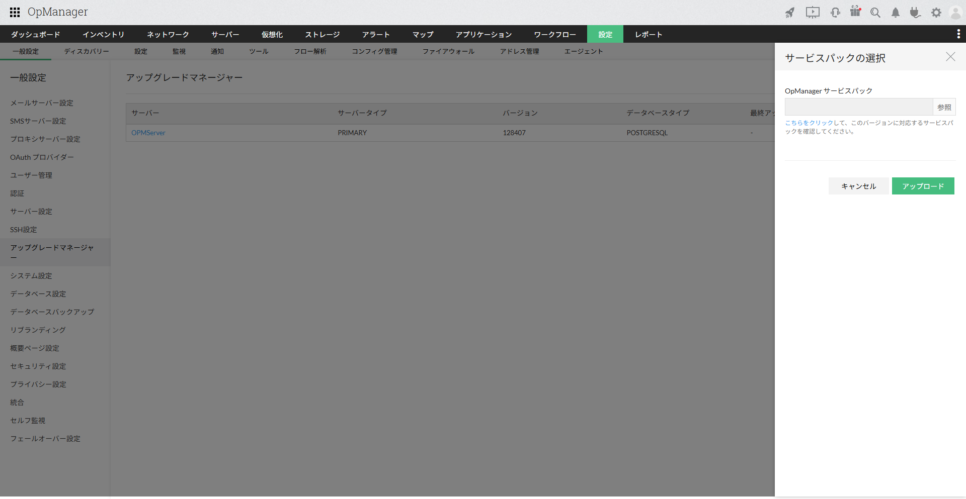 画面右側の「サービスパックの選択」から、アップグレードに使用するサービスパックを指定し、[アップロード]をクリックします。