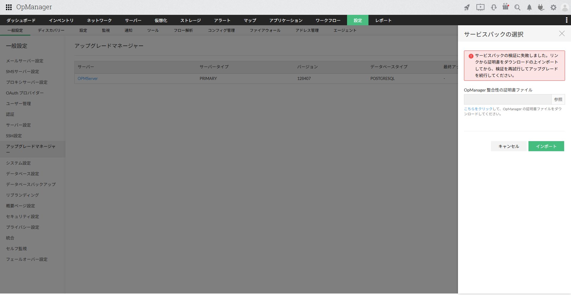 環境によっては以下のメッセージが出現し、サービスパックを検証するための証明書のアップロードが必要になる場合があります。