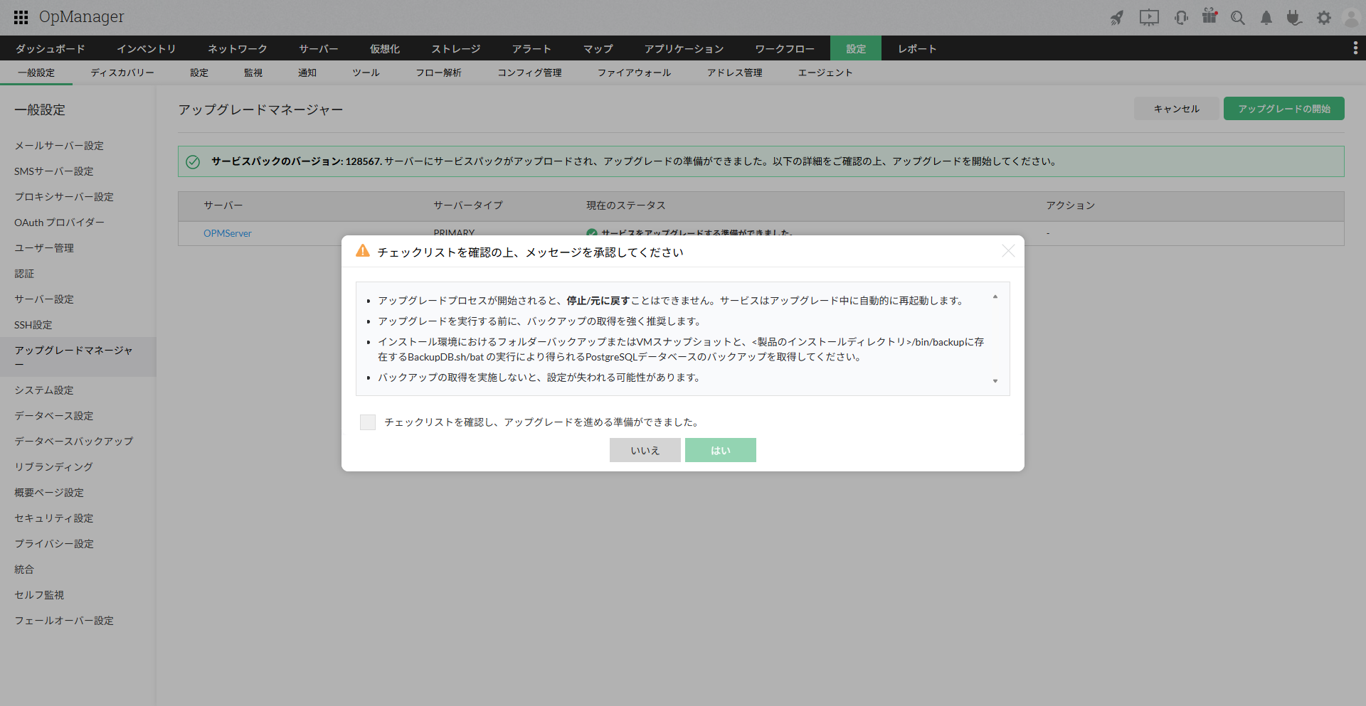 アップグレード前の注意事項(チェックリスト)がポップアップで表示されます。 -