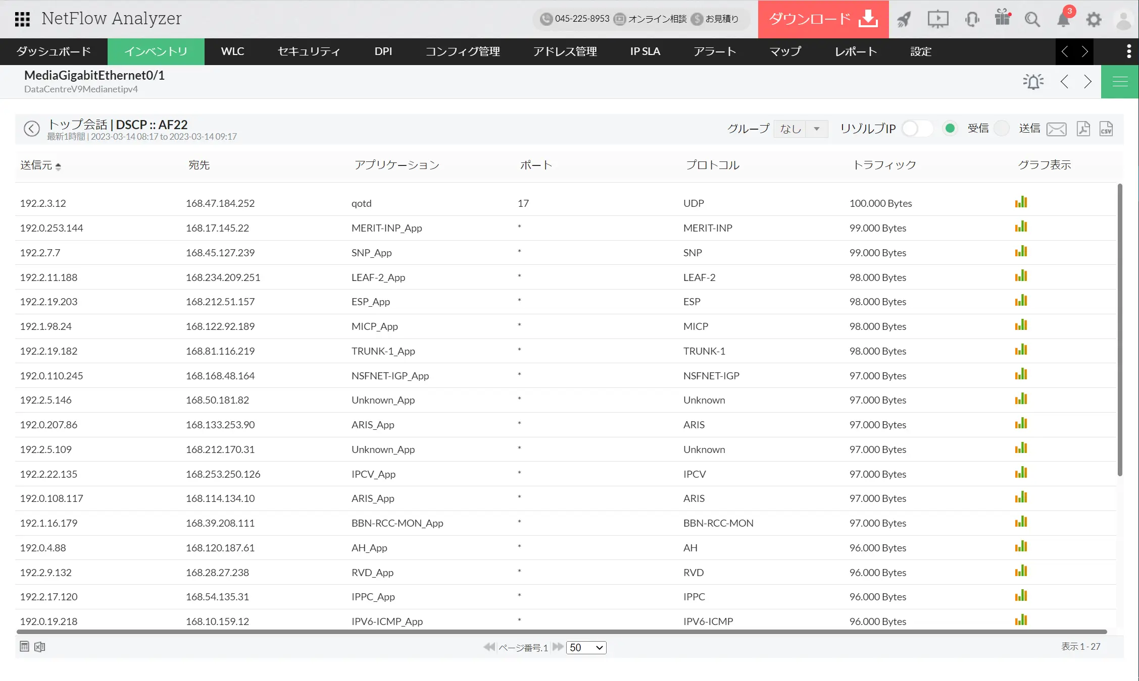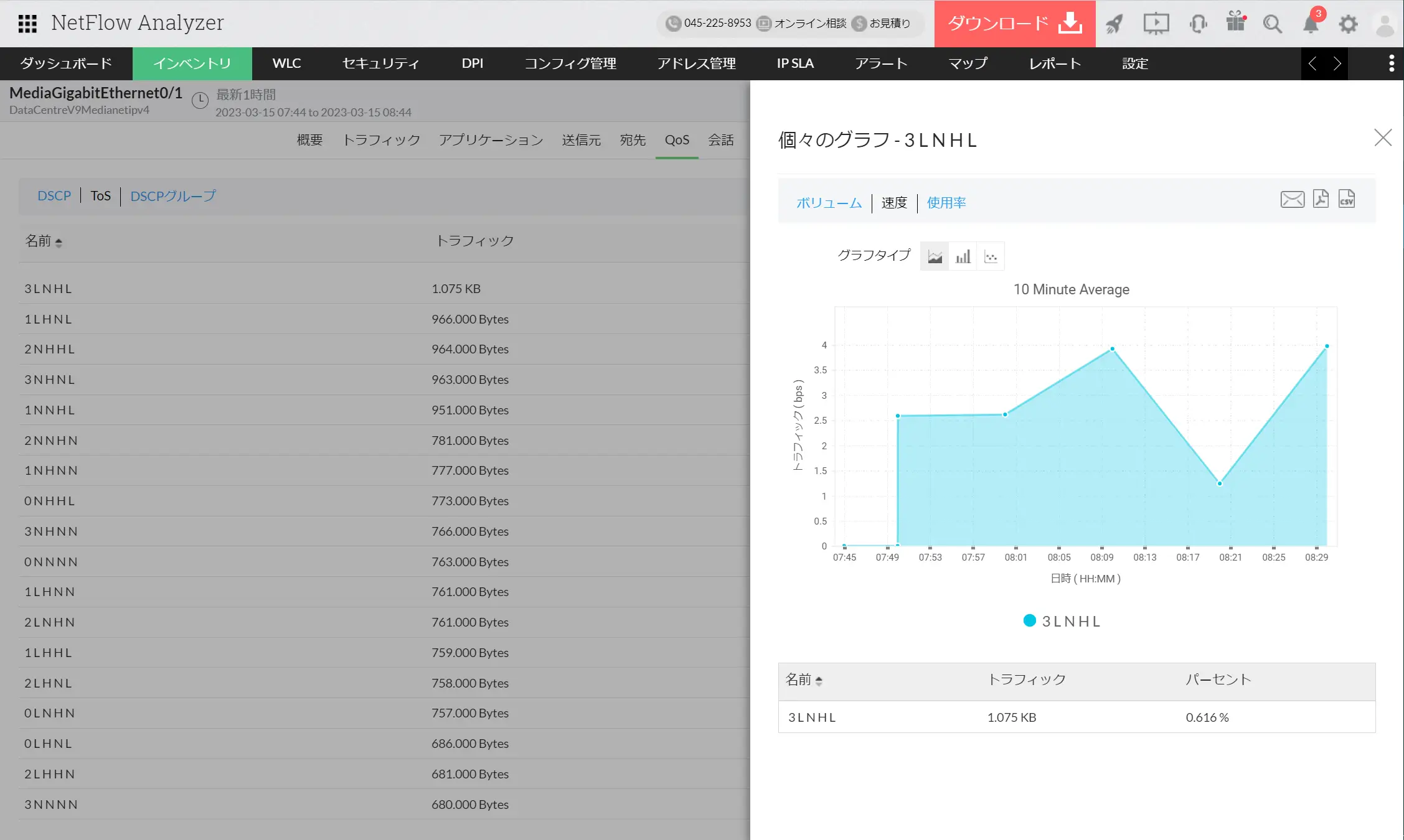 監視対象のインターフェースのDSCP値ごとのトラフィック量や割合などを監視できます。各DSCP値をクリックすることで、送信先/宛先IPアドレスやアプリケーションなどの通信の内訳情報も細かく確認できます。各DSCP値や各通信のトラフィック量をグラフ形式で可視化することも可能です。