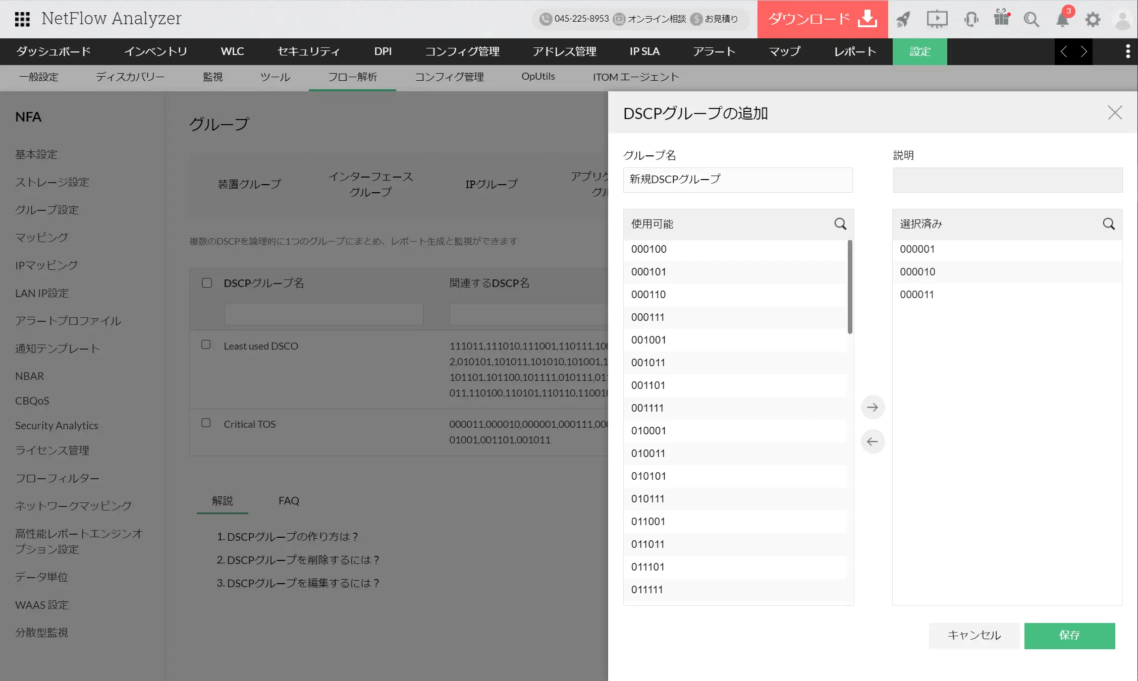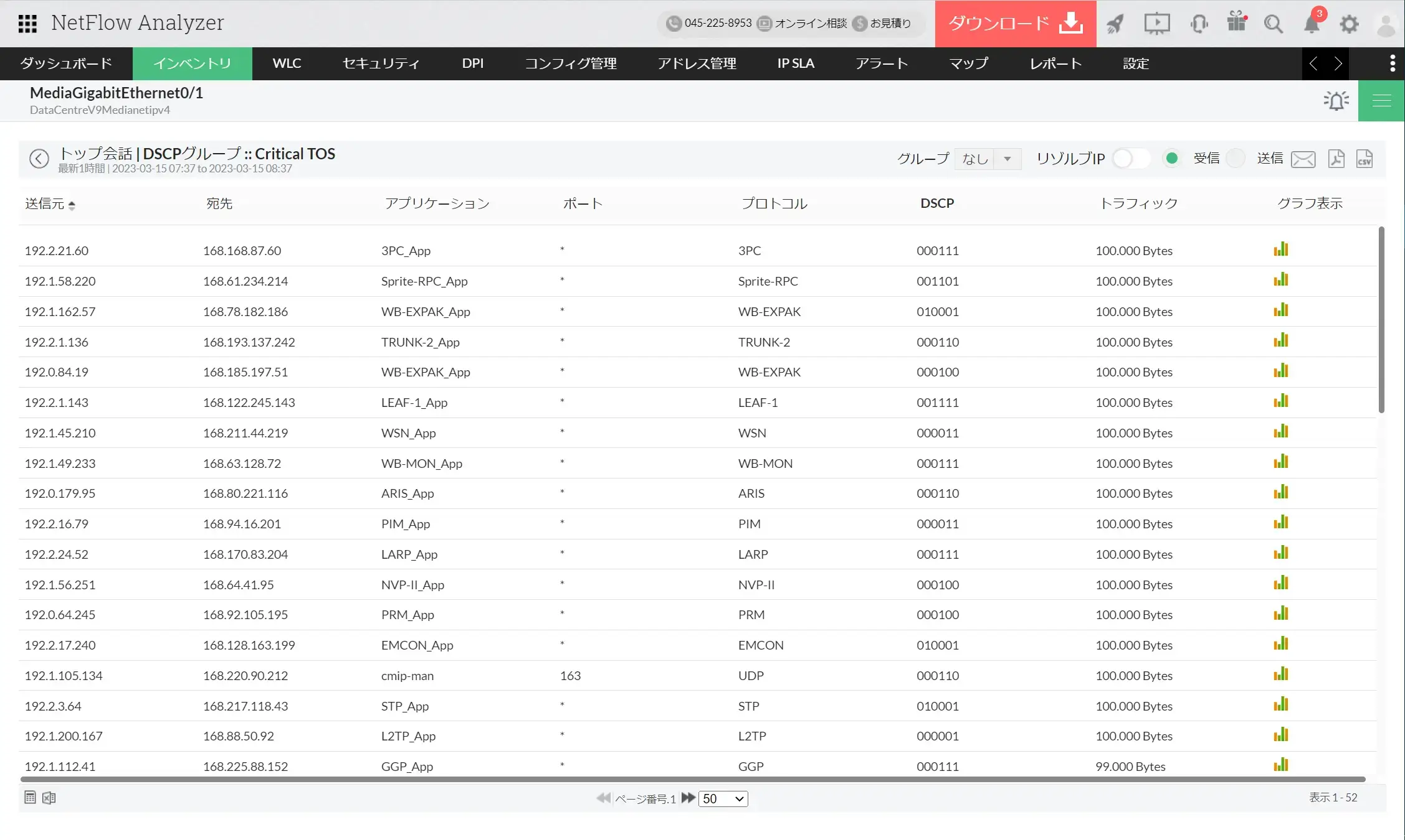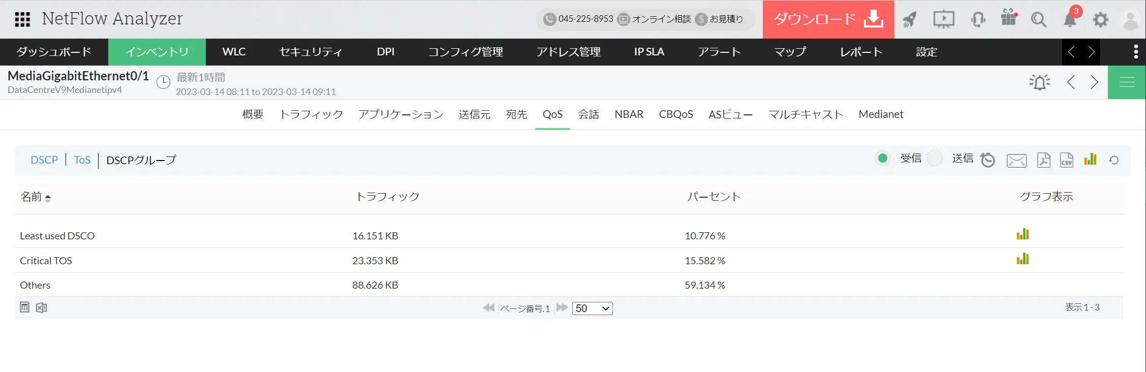 NetFlow Analyzerは、ネットワークにおけるQoS(Quality of Service/サービス品質)を保証するパケットのDSCP値やToS値を可視化します。パケット内の具体的なDSCP値やToS値ごとの詳細情報を監視することで、特定の通信に対して適切なDSCP値が割り振られているかの確認などにご活用いただけます。