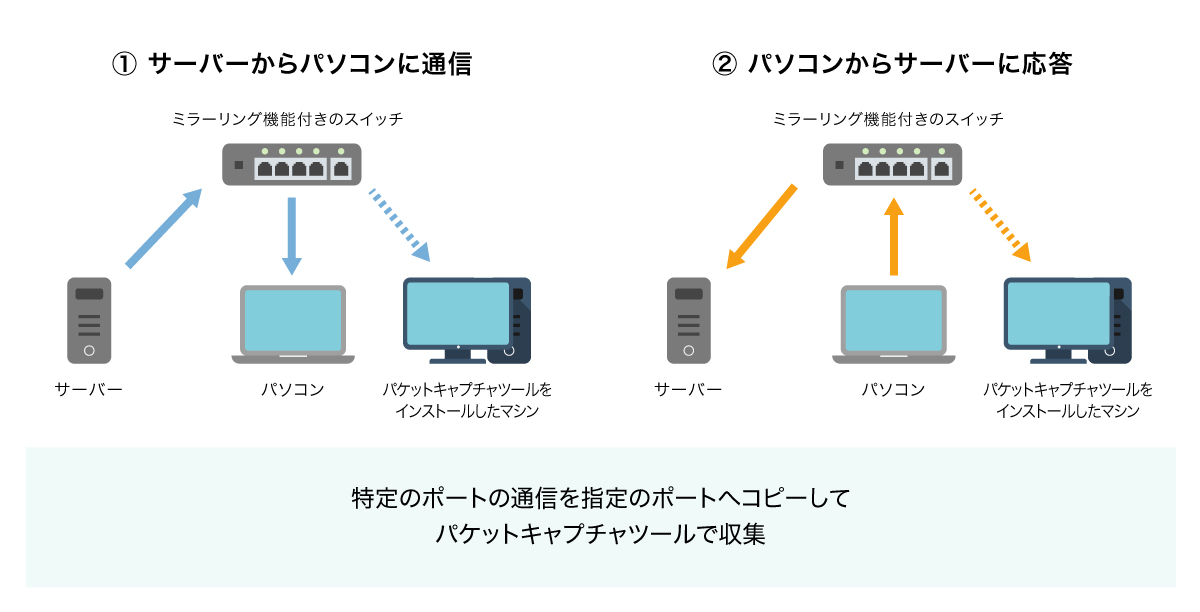 パソコンのみでパケットキャプチャを行う方法です。パソコンが送受信するすべてのパケットを収集できます。特定のパソコンがネットワークに接続できない場合などの原因調査などを行うことができますが、ネットワーク全体の通信を把握することはできません。