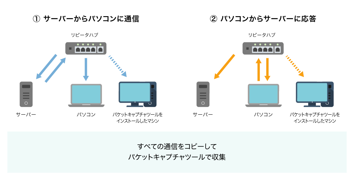 リピータハブを利用してパケットキャプチャを行う方法です。リピータハブでは、入ってきたパケットを全ポートにコピーします。ハブの空いているポートにパケットキャプチャツールを接続することで、ハブを経由するパケットを収集できます。通信の利用状況の把握やトラブルシューティングなどに活用されてきましたが、近年ではスイッチ(スイッチングハブ)の利用が一般的であり、リピータハブはあまり使用されていません。