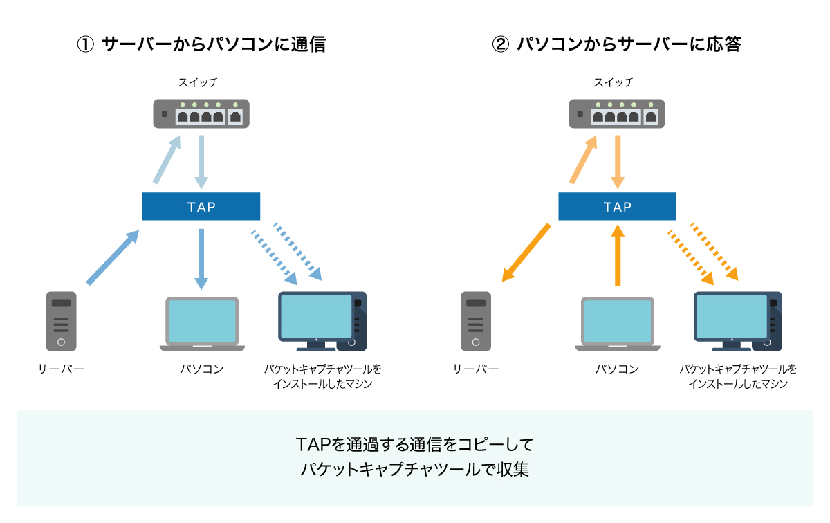 TAPを利用してパケットキャプチャを行う方法です。TAPとは、自身のポートを通過するパケットを収集し、パケットキャプチャツールなどに送信する機器です。ネットワークの中のパケットを収集したい場所に、物理的に設置する必要があります。機器を別途購入する必要がありますが、ミラーリング機能を利用できるポートがない場合などに、通信の利用状況の把握やトラブルシューティングなどに活用されています。