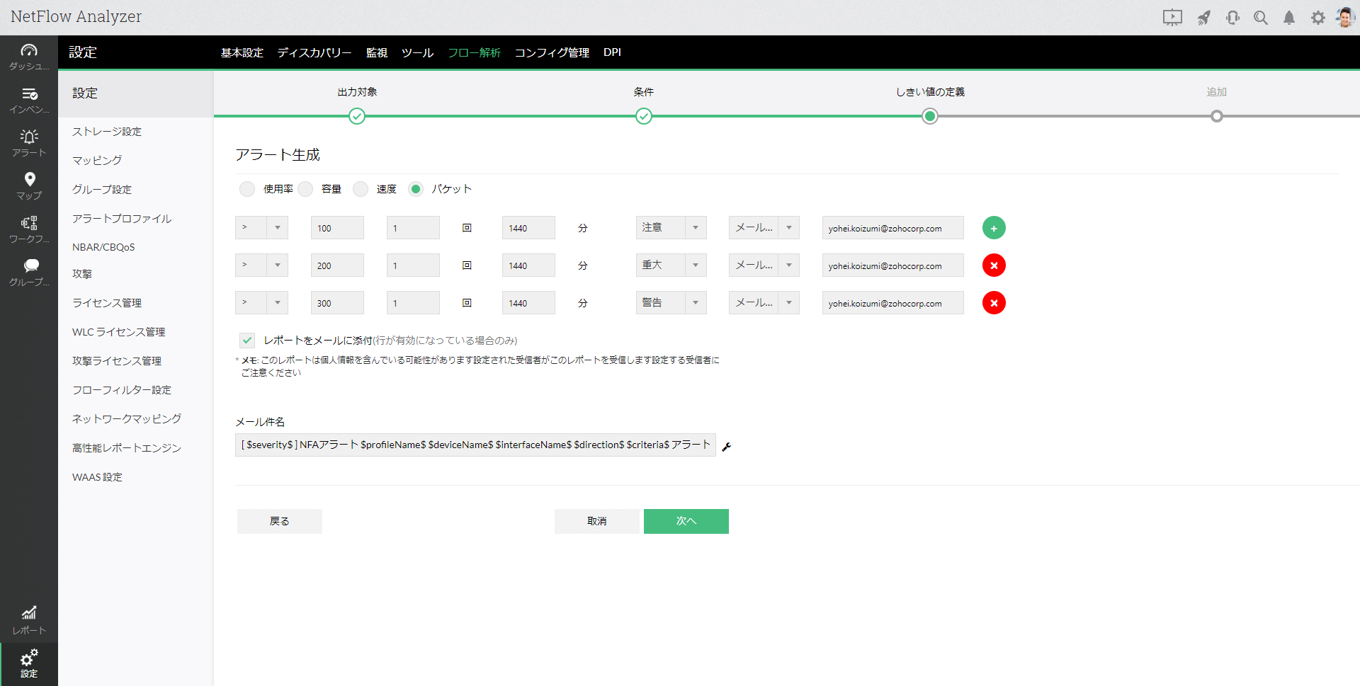 NetFlow Analyzer では、トラフィックの帯域使用率があらかじめ設定されたしきい値を超えた時に、アラートを生成してユーザーに通知することができます。使用率/持続時間/頻度に基いてしきい値を設定可能です。アラートプロファイル機能により、しきい値を作成し効率的に管理することが可能です。