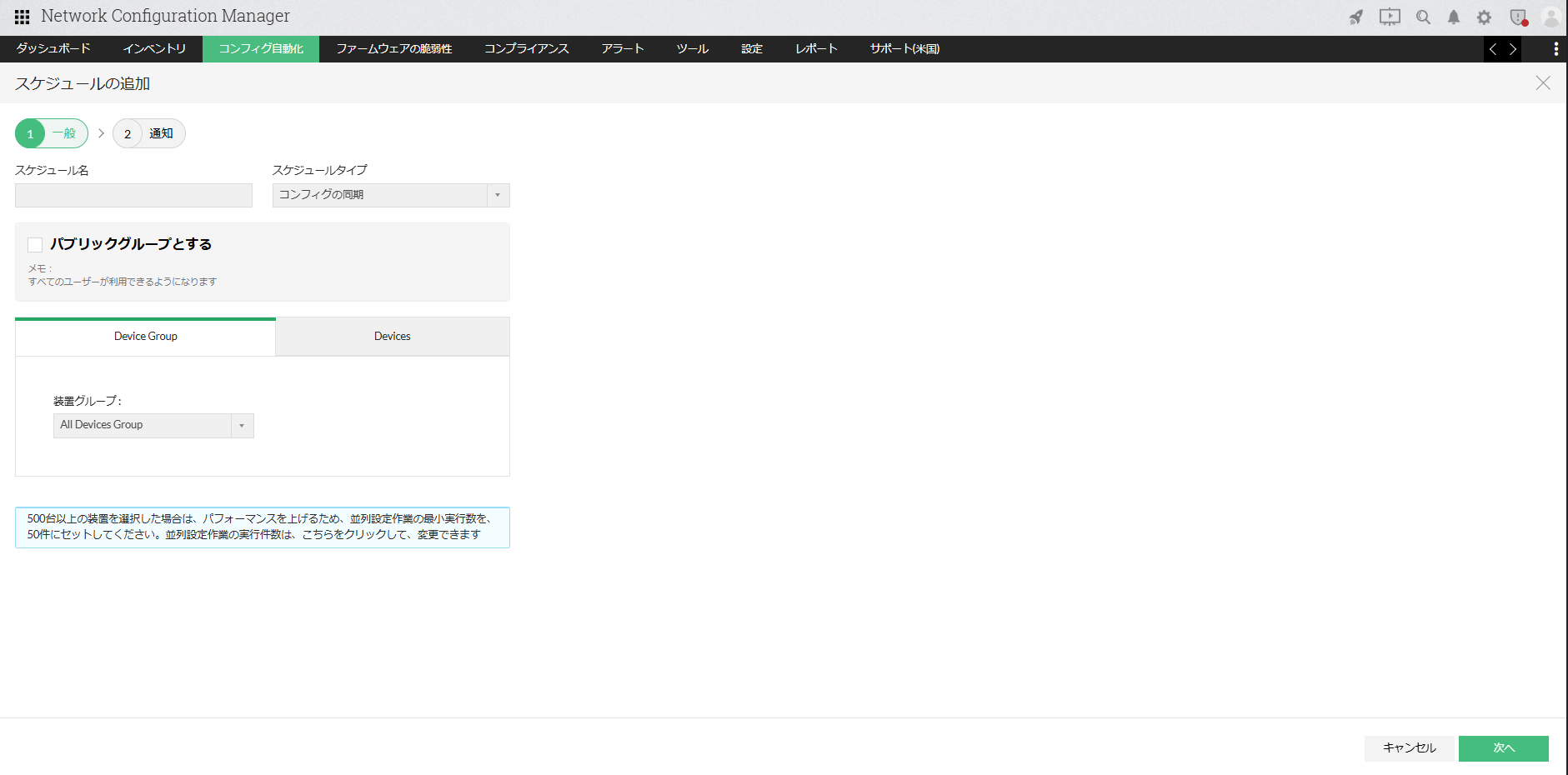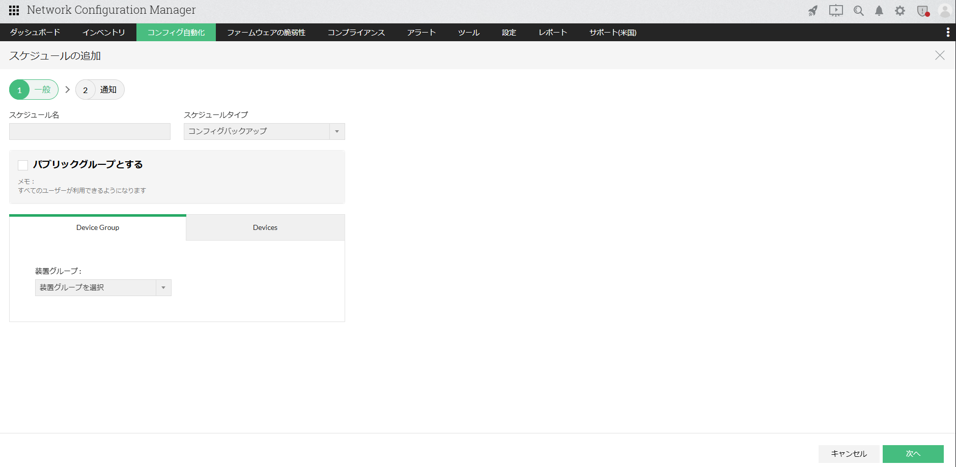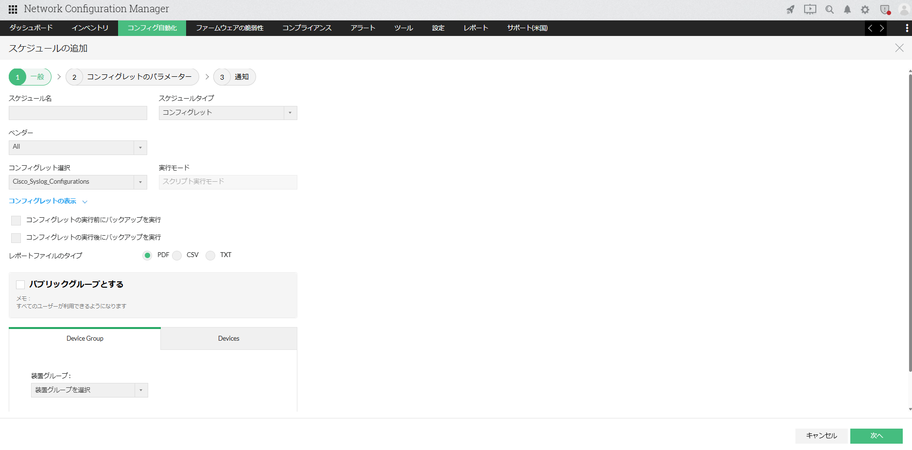 スケジュールでは、装置または装置グループを指定することができ、1度のみの実行や日次や週次など定期的な実行も設定可能です。