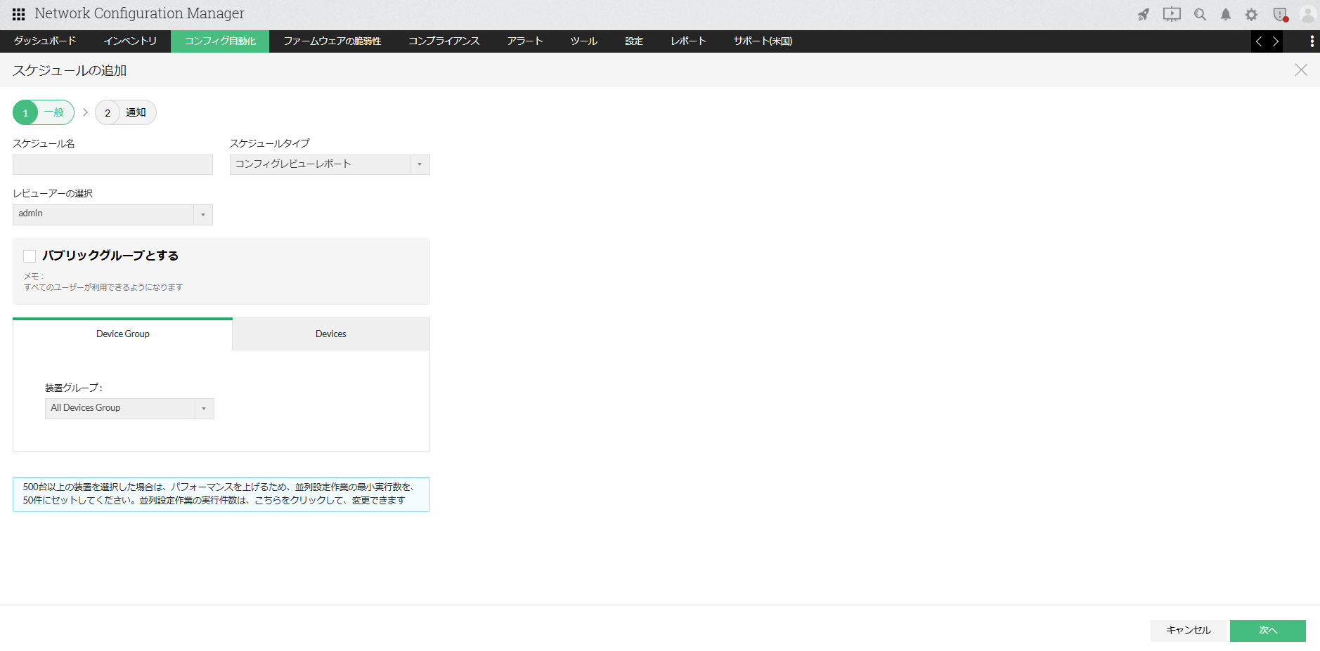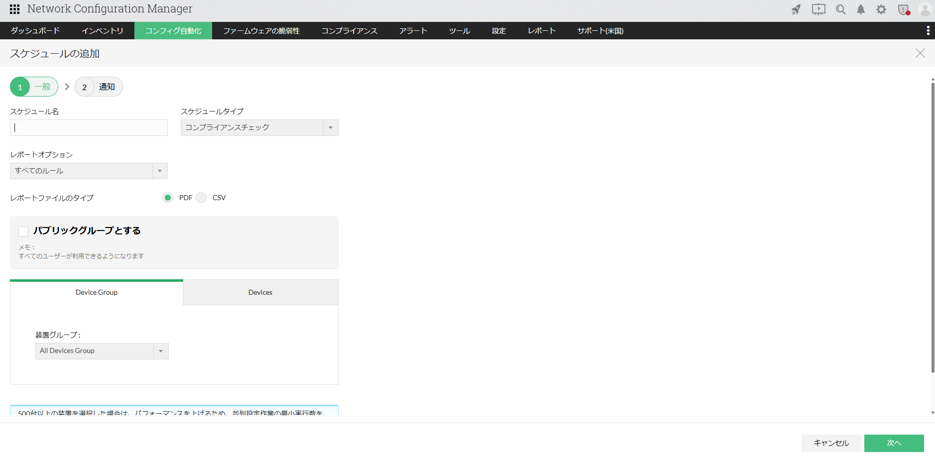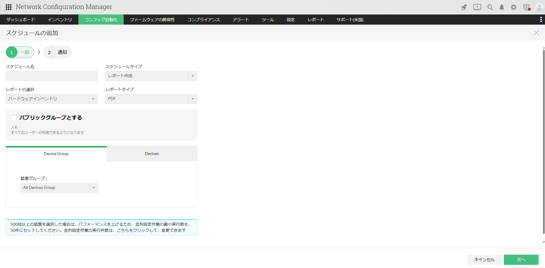 スケジュールでは、装置または装置グループを指定することができ、1度のみの実行や日次や週次など定期的な実行も設定可能です。