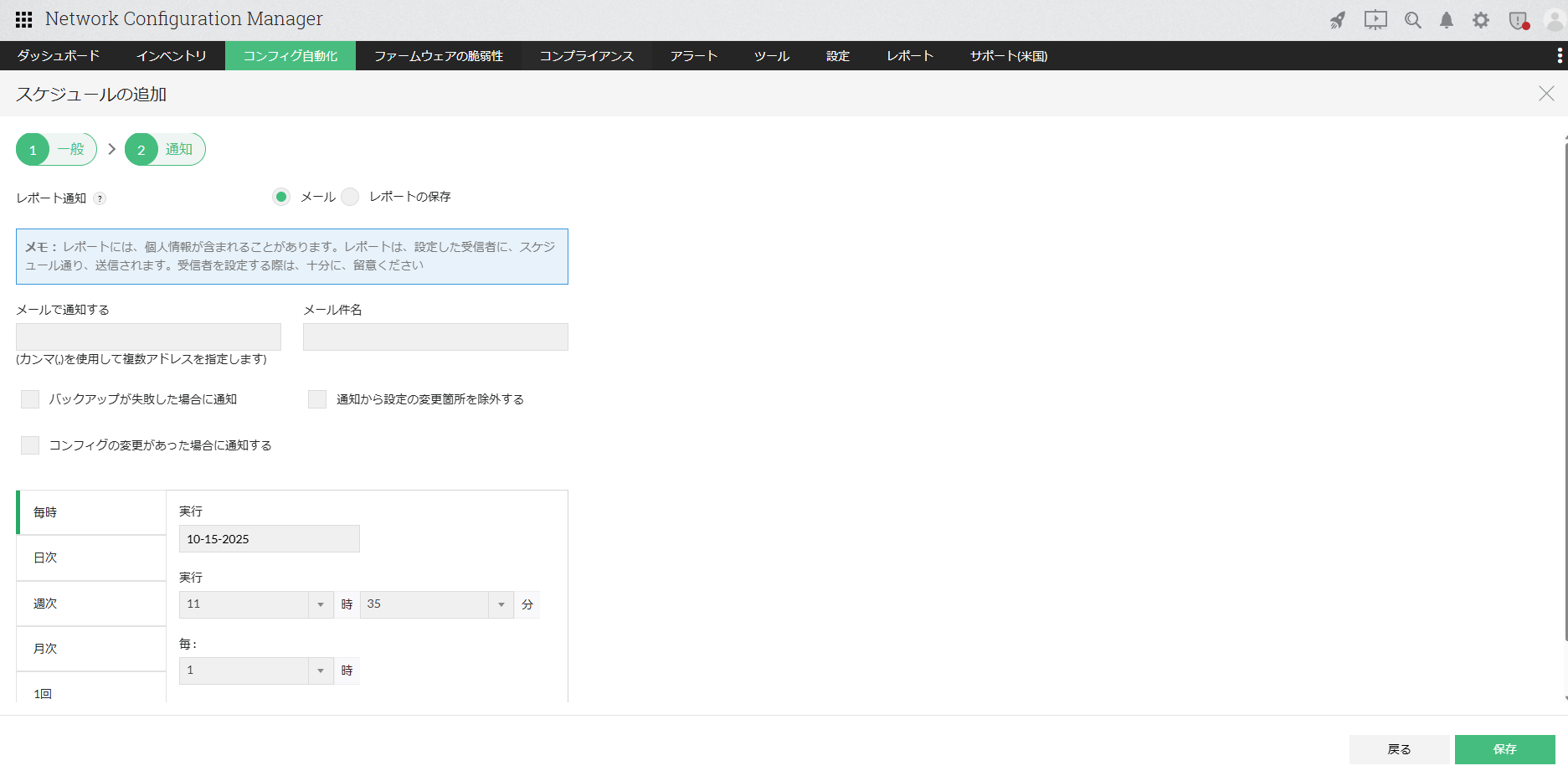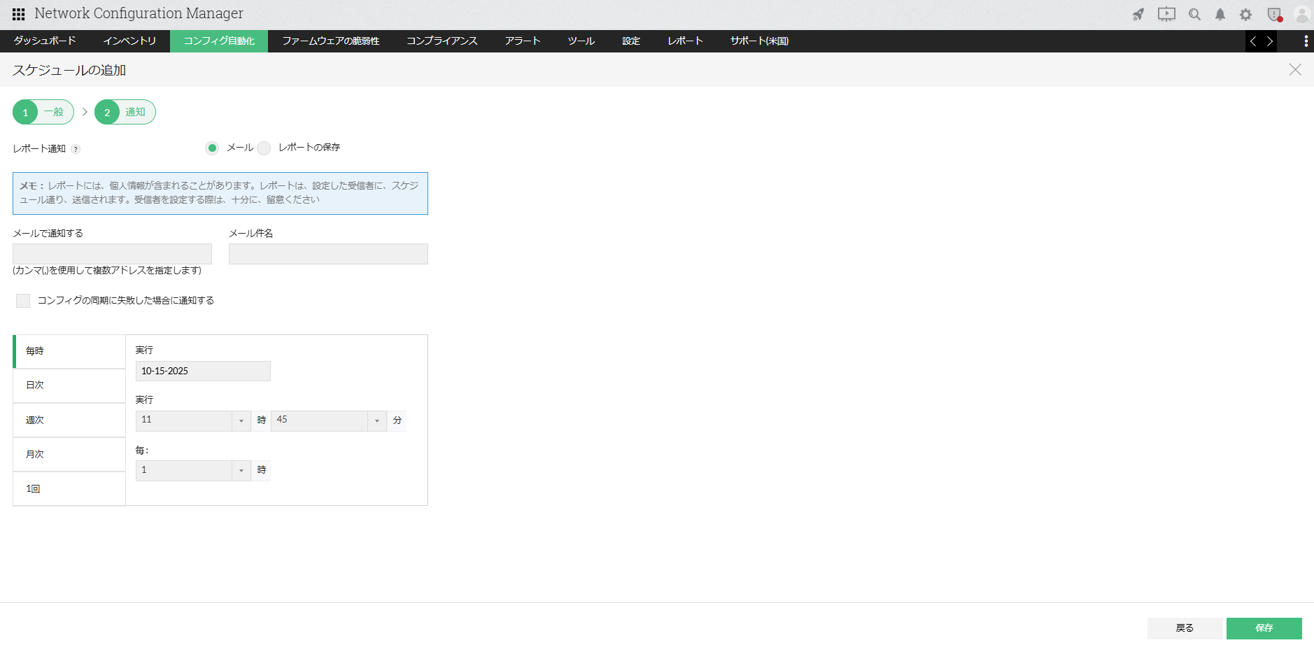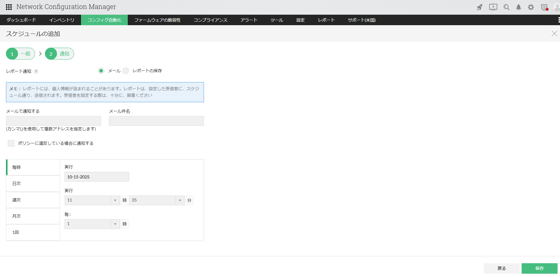 スケジュールの結果は、メールでユーザー通知できます。必要に応じて、[レポート通知-メール]を選択してください。