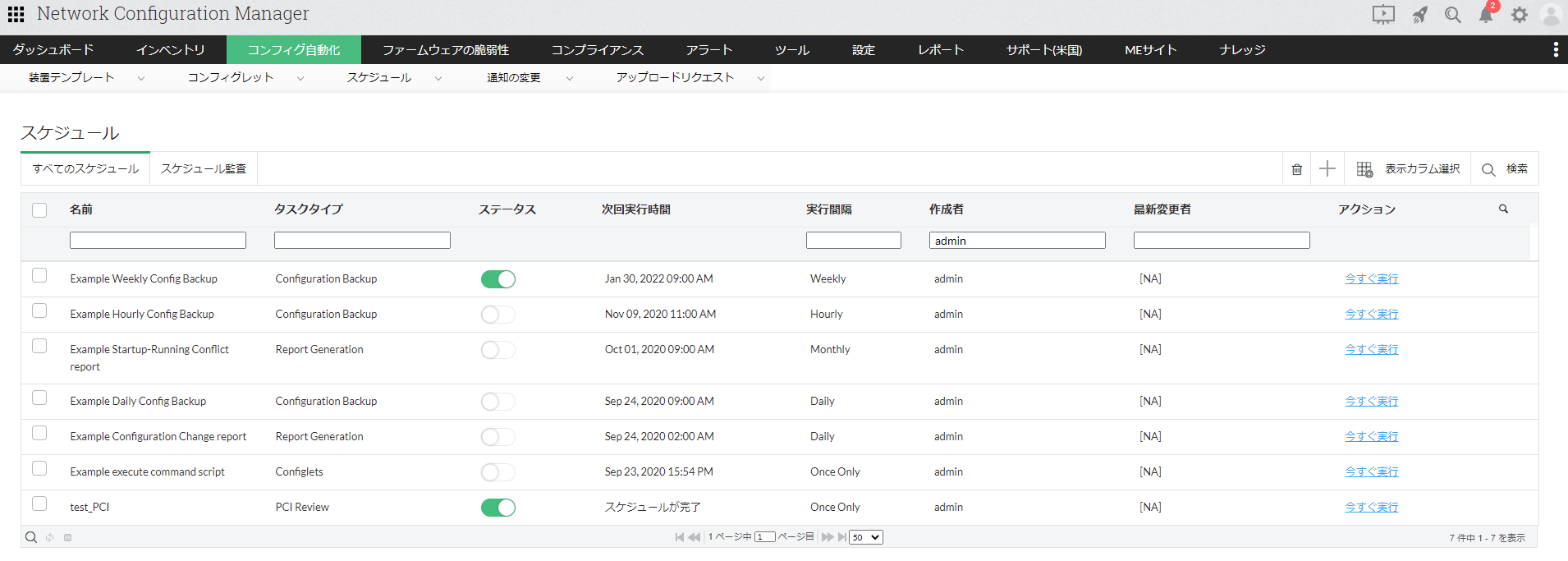 実行されたスケジュールは、[コンフィグ自動化]→[スケジュール]→[スケジュール監査]画面から実行履歴を確認できます。