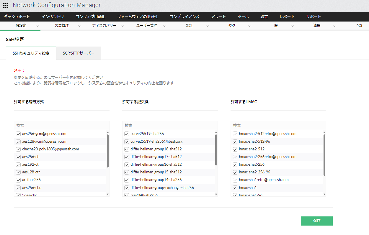 Network Configuration ManagerでSSH通信を行う上でのSSH暗号化設定や、SCP/SFTPサーバーに関する設定を行います。