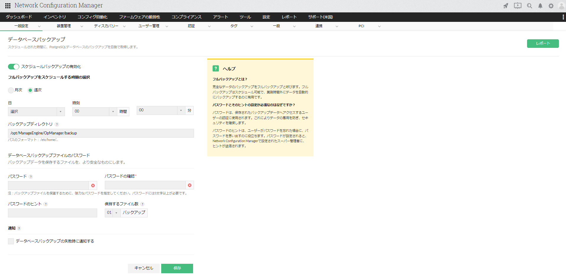 機能 保存される情報 装置ディスカバリー 認証情報の設定とディスカバリーレポート(実行履歴) インベントリ 取得したコンフィグ、装置テンプレートの割り当て状況、カスタムカラム、認証情報など 装置グループ化 装置グループの設定情報 コンフィグバックアップ(管理、比較) 装置から取得したコンフィグ情報と世代数、比較情報 コンフィグレットによる一括変更 コンフィグレット設定と実行履歴 ターミナルによる変更、変更・操作履歴の管理 ターミナル機能からのCLI操作履歴 リアルタイム変更検出・通知・ロールバック機能 変更通知(メール通知やロールバックなど)の設定と実行履歴 レポート [レポート]配下の設定(取得したEOL/EOS情報、詳細レポート、カスタムレポート) コンプライアンス管理 [コンプライアンス]配下の設定(ルール、ルールグループ、ポリシーの設定と各紐づけ情報) ファームウェアの脆弱性チェック [ファームウェアの脆弱性]の設定(脆弱性DBの同期設定やインポートした情報) 装置テンプレート、スケジュール(コンフィグバックアップ/同期(Startup/Running)、レポート生成)、承認リクエストフロー [コンフィグ自動化]配下の設定(スケジュール(装置テンプレート、コンフィグバックアップ/同期(Startup/Running)、レポート生成)、アップロードリクエスト)と実行履歴 ユーザーの作成、コンフィグの操作履歴の確認 ユーザー情報(ID、パスワード、メールアドレスなど)、各ユーザーの操作履歴([インベントリ]→[装置]→特定装置をクリック→[操作]) - バックアップに含まれないデータ