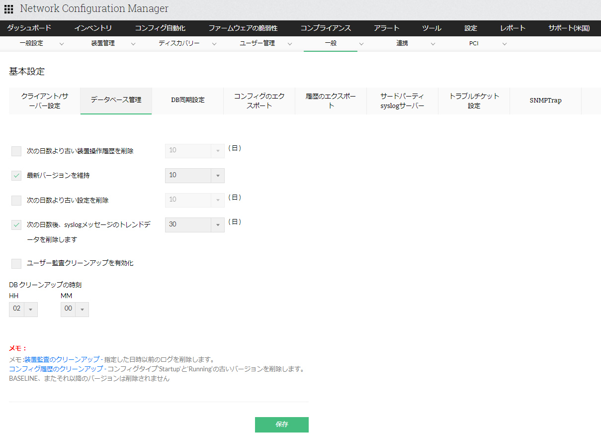 | DBクリーンアップの時刻 | 上記設定のクリーンアップ時刻を設定します。 デフォルト:毎日午前2時 |
