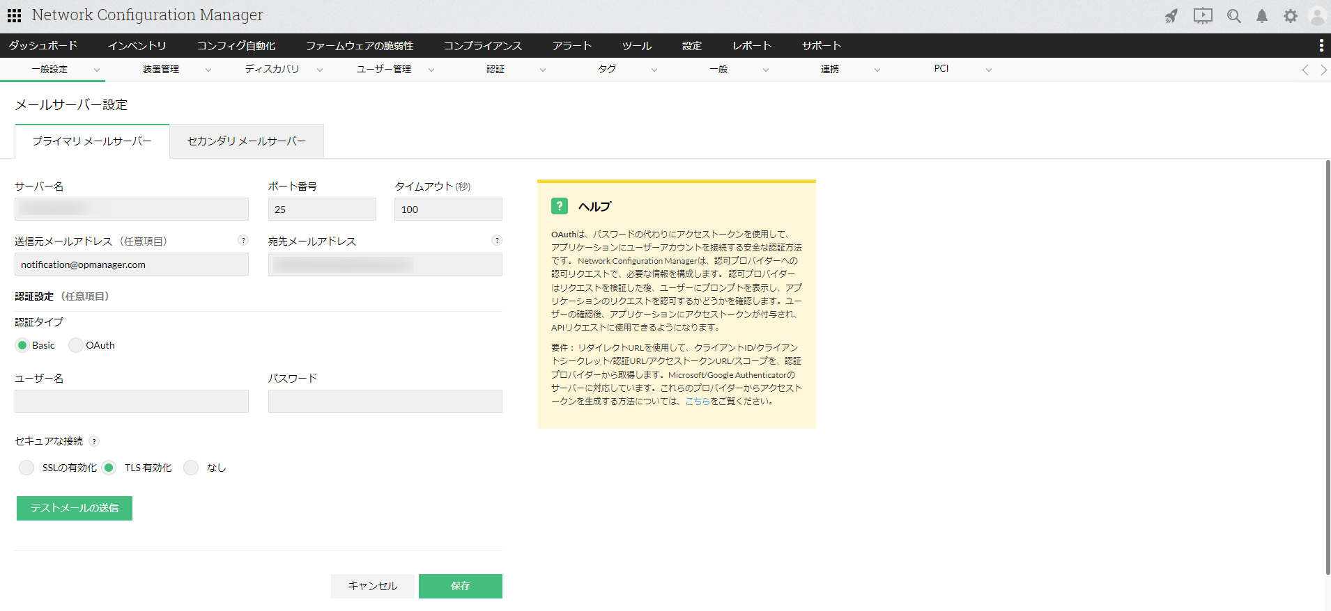 | セキュアな接続の詳細(任意) | [SSL の有効化]を選択し、メールサーバーとNCMサーバー間の接続をセキュアにします。 [TLS 有効化]を選択し、メールサーバーとNCMサーバー間の接続をセキュアにします。 セキュア接続が不要な場合は、[なし]を選択 |