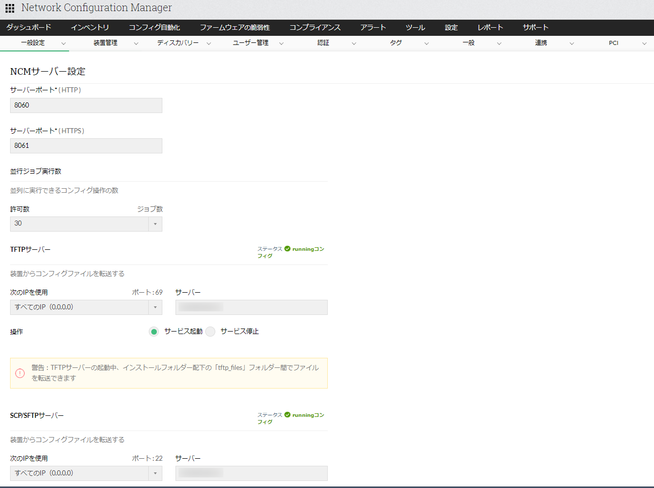 | SCP/SFTPサーバー | 装置テンプレートで「SCP」または「SFTP」を選択し、コンフィグファイルの転送に使用します。 ・次のIPを使用:全てのIP(0.0.0.0)またはインストールサーバーのNIC IPを設定 ・サーバー:Network Configuration ManagerのSCP/SFTPサーバーとして使用するIP(デフォルト:インストールサーバーIP) |
