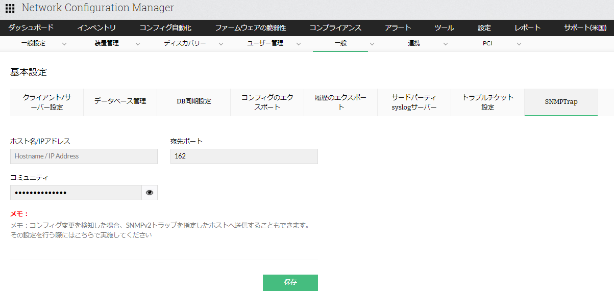 SNMPトラップ設定は、[設定]→[一般]→[SNMP Trap]から設定します。