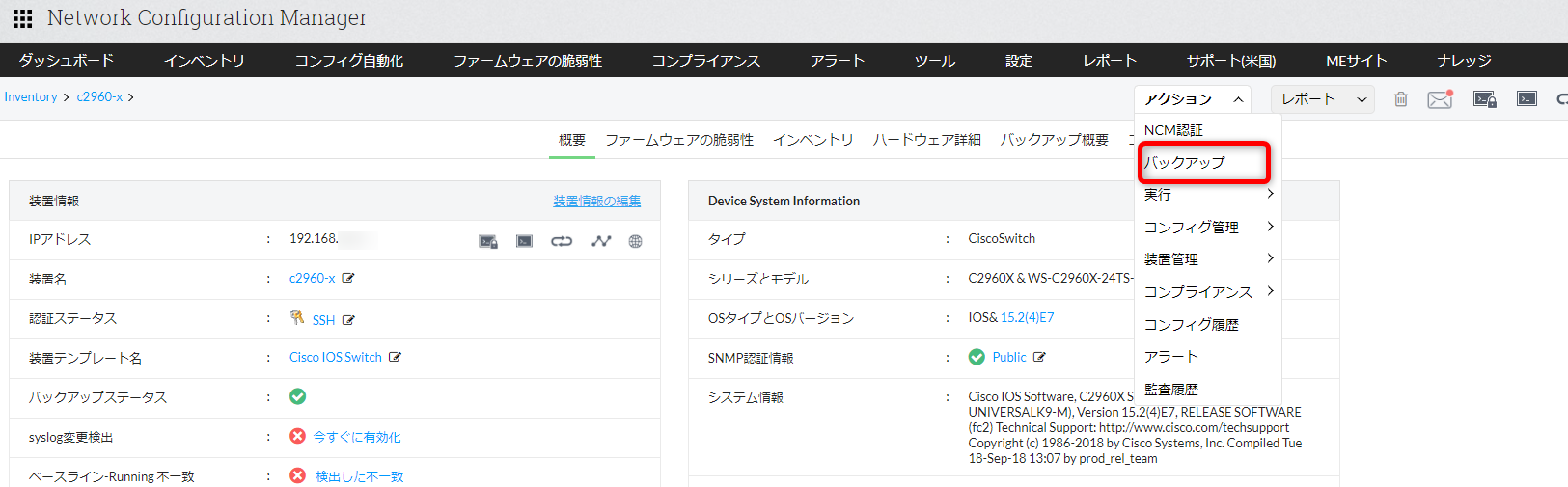 バックアップとは、装置から最新のコンフィグ(startup/running)を取得し、Network Configuration Managerに転送することを意味します。