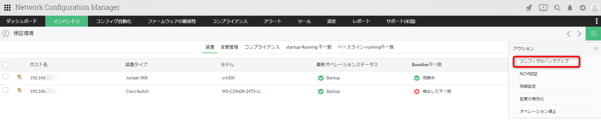 - 画面右上の[≡]から[コンフィグのバックアップ]をクリックし、装置グループに割り当てられている装置を対象にバックアップを実施