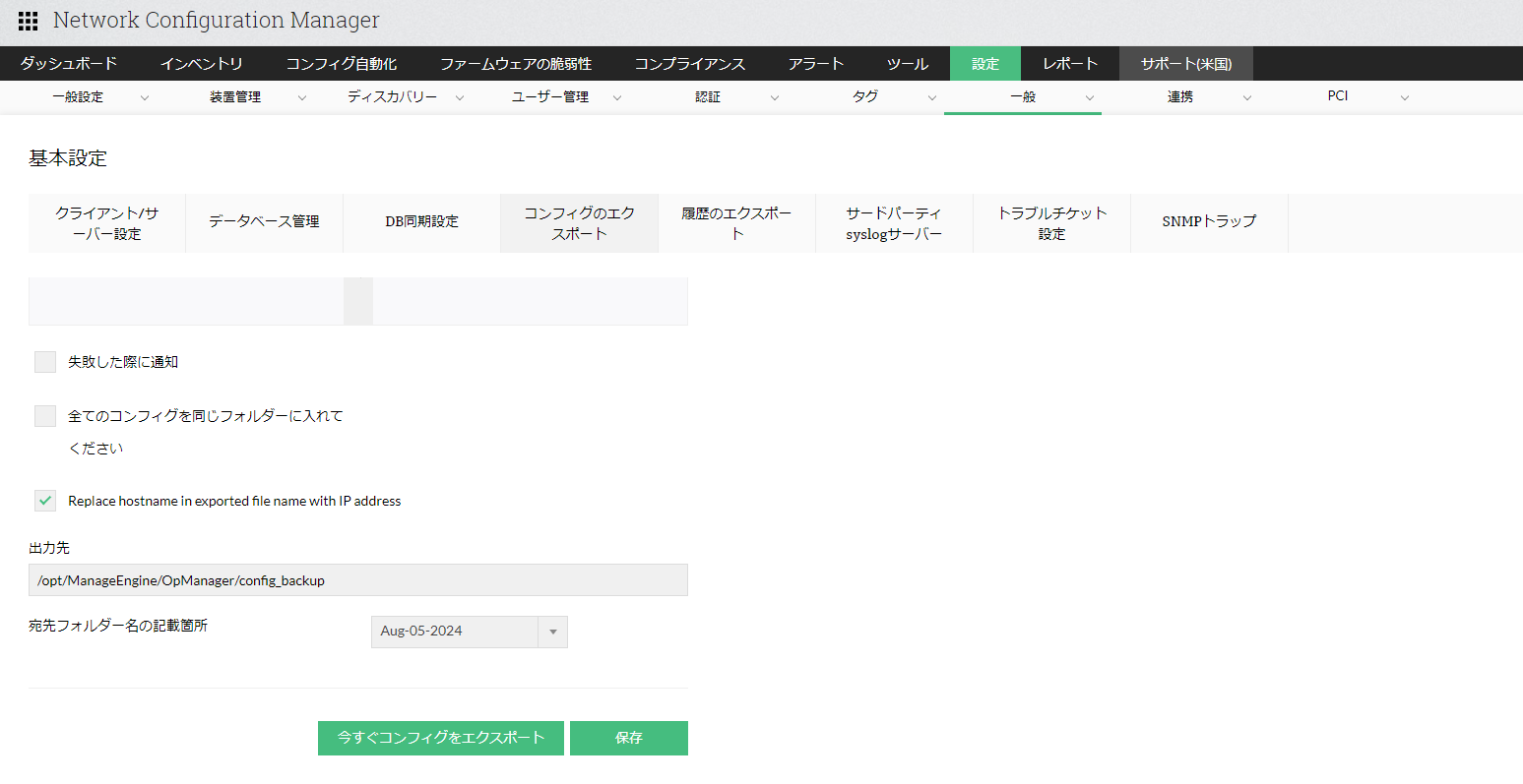 - コンフィグエクスポートの実施スケジュールを「実施しない/日次/週次/月次」より選択(デフォルトでは実施しない)