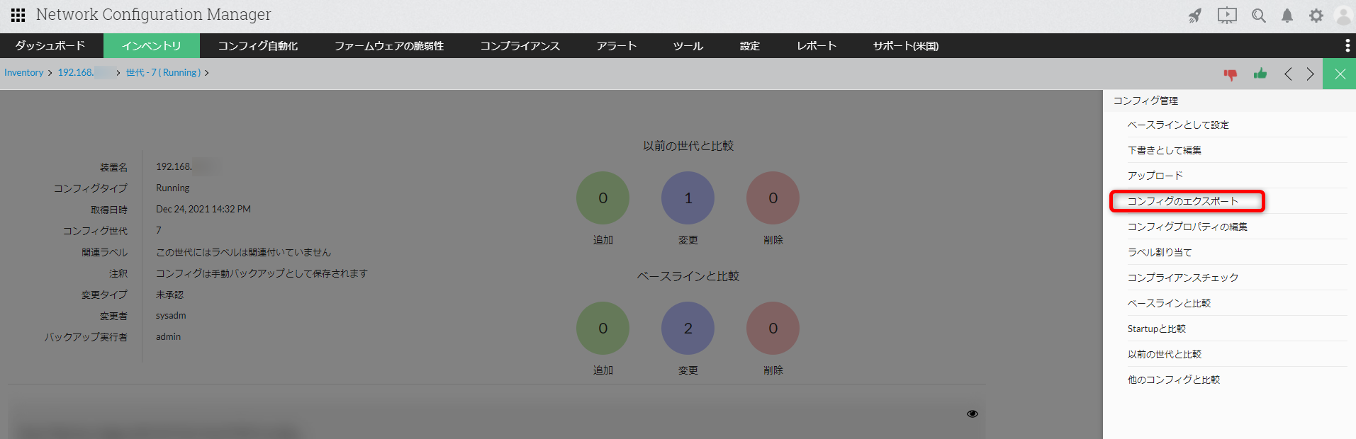 - コンフィグ内容を確認し、画面右上の[≡]から[コンフィグのエクスポート]をクリック