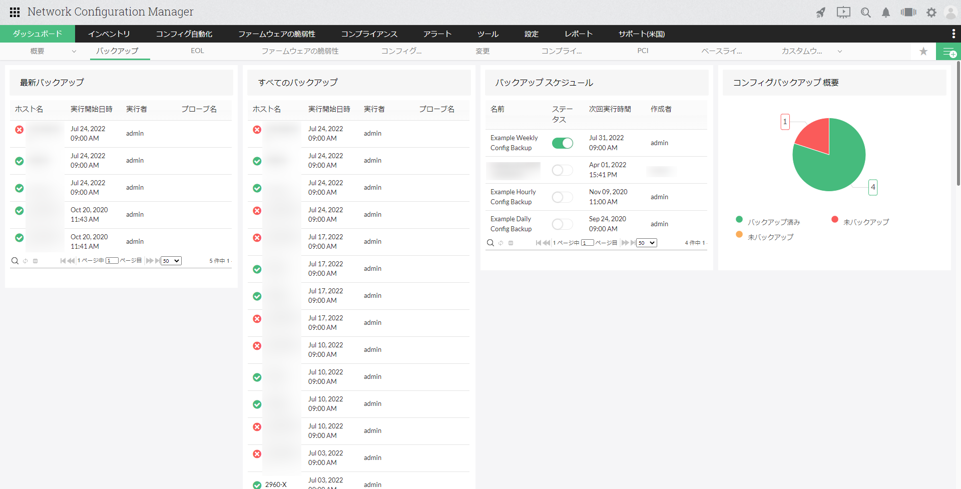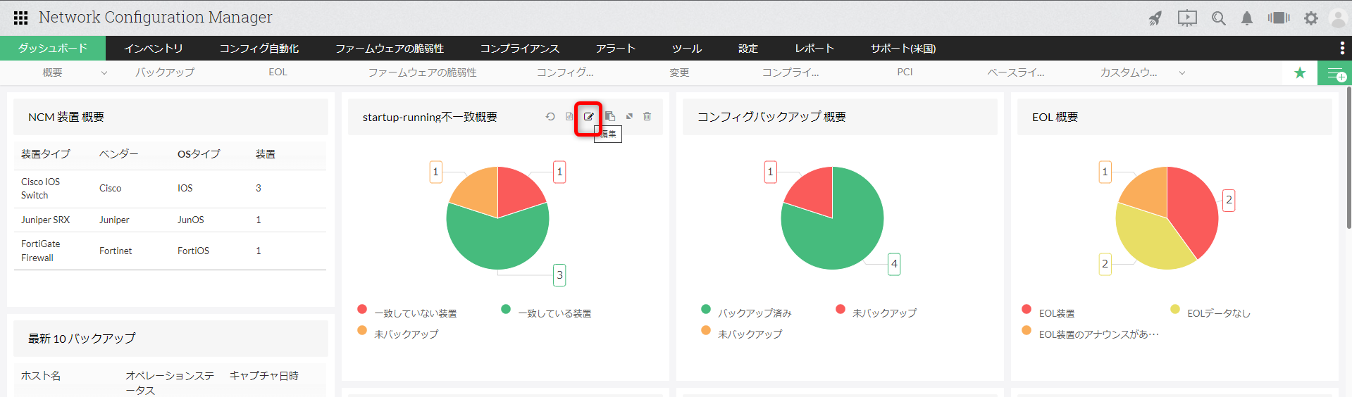| 最新10バックアップ | 直近でコンフィグバックアップを実行した対象装置、ステータス、実行日時を表示します。 |